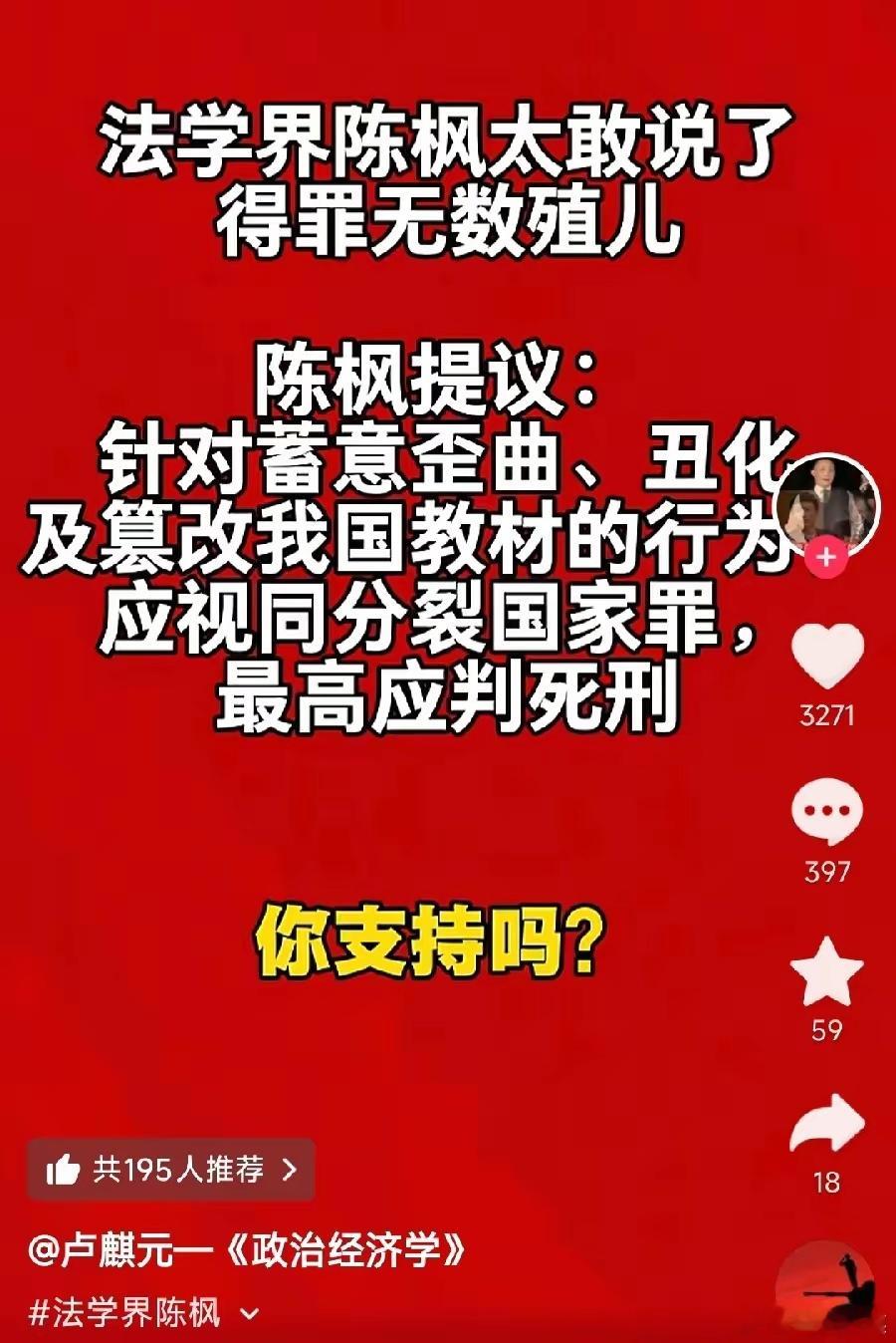 卢麒元转发陈枫提议: 针对蓄意歪曲、丑化以及篡改我国教材的行为,应该视为分裂国家罪,最高应判死刑。这些年毒教材事件层出不穷,这种明目张胆的对教材下手谁给的勇气? 是监管力度跟不上?还是惩罚力度跟不上? 给了这些人有恃无恐的底气?支持陈枫提议,支持对毒教材罪恶黑手判死刑!
