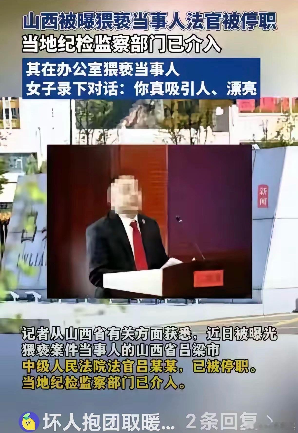 山西法官猥亵女当事人案件真是让人不寒而栗!当事法官居然是审判监督庭庭长,此庭的职责是:确保司法程序依法秉正执行,维护刑事案件公正审判的重任。它具有审理刑事案件的权力,也有监督当事人、检察机关与司法机关的正常行为的职责。据后续消息,继第一个女案件当事人网上报料后,又有另外一个女案件当事人报料经历过一模一样的猥亵。根据报料的16分钟录音显示:涉事法官说“我的庭我做主,你若接受我,我可以在财产分割上向你一方倾斜。”听着这些赤裸裸的厚颜无耻的话,法律完全变成了他家的自留地,想怎么判,就怎么判。法院是定纷止争的最后一道防线,是确保公平公正的堡垒,如果这最后一道防线失守了,那岂不是成了弱肉强食的丛林社会?友友们说是不是呢?
