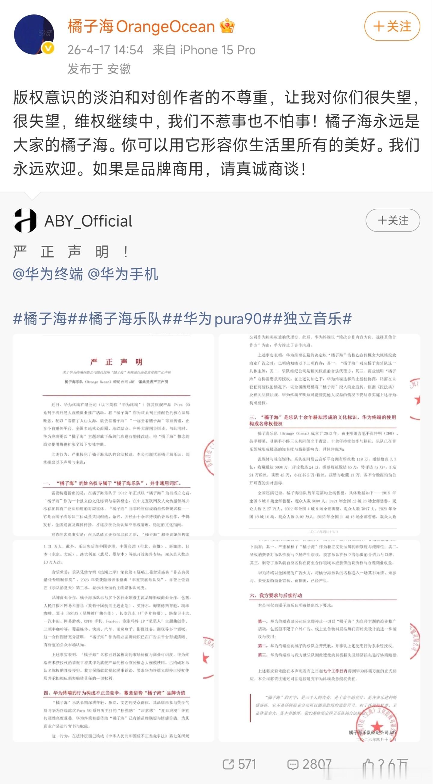 橘子海乐队声称华为Pura 90系列橘子海配色宣传严重侵权,我不站队,单纯和大家聊点儿法律常识。首先你们发公告指责华为侵权,那就必须要聊明白对方侵犯了你们哪项权利对吧?在这份声明里橘子海乐队经纪公司先是提出了专属姓名权概念,然后又说华为构成名称权侵权,随后橘子海乐队认证微博转载声明时又指出这是版权意识的淡薄。那么问题来了,你们到底要向华为主张哪项权利?姓名权?名称权?还是版权?先说姓名权,姓名权是自然人才可以享有的权利,而橘子海在法律上来讲显然构不成自然人主体概念。再说名称权,名称权是需要登记注册才能生效的权利,而且主张这项权利还要考虑涉事双方行业关联、是否专用、所属地域。并不是你们只要起名叫橘子海,别人就一律用不了橘子海这个词。不信大家动动手指去企业查询工具上检索一下,别说产品名称了,全国各地以橘子海命名的在营企业都一大堆。要是这些都能告赢的话,依我看也不用再搞商业演出了,天天起诉拿赔偿直接走向财富自由。最后说版权,这就更无厘头了,版权是针对于具体作品的权利。你们要是说企业做宣传盗用乐队原创歌曲没有付费,这才涉及具体曲目的版权问题,手机配色起名和版权概念范畴压根儿就不挨着。目前来看这事儿唯一的槽点就是这份声明中说华为方面曾与乐队经纪团队进行过接触,最后又终止了合作沟通。我不了解具体细节,这里就不妄下结论了。橘子海乐队如果真要维权的话,我的建议是尽快找个专业律师咨询一下,先弄清楚自己究竟要向华为主张哪项权利,然后再评估具体可行性。真觉得有把握打赢官司的话,直接去告就完事儿了,社交平台赛博论案没有任何意义。橘子海乐队称华为侵权魔金石科技