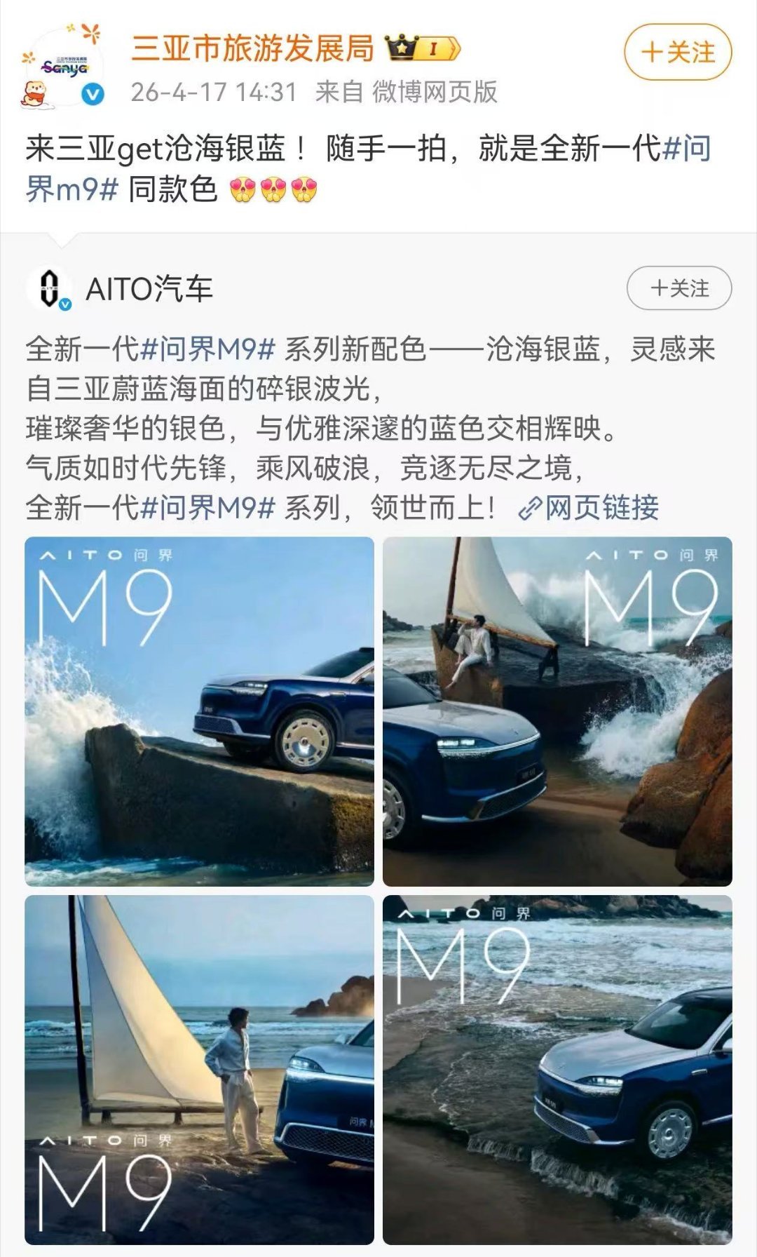 哇!全新一代问界M9要来了!4月22号正式亮相+开启小订。这车真是把“科技豪华”玩明白了,你看,全新大漠金棕、赛里木青配色,质感拉满,赛里木景区、三亚文旅部门也出来认证了问界M9新车色获文旅共同认证,从销量冠军到标准制定者,M9这次要重新定义50万级豪华SUV的门槛。坐等发布!大v聊车