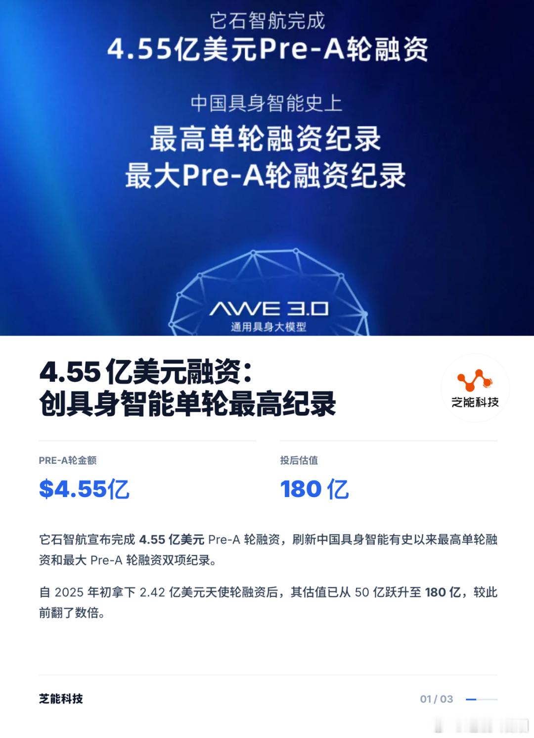 它石智航近期完成 4.55 亿美元 Pre-A 轮融资,折合人民币约 33 亿,接连刷新国内具身智能单轮与 Pre-A 轮融资纪录。短短一年,从天使轮到 Pre-A,估值稳步攀升,头部资本、产业方与国资集中入局,赛道热度肉眼可见。