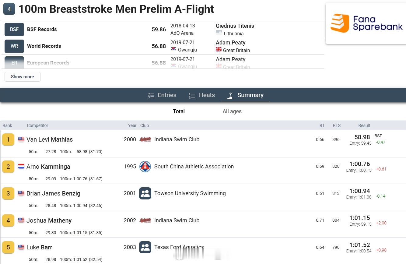 Bergen Swim Festival 男100蛙预赛🇺🇸Van Mathias 58.98 PB