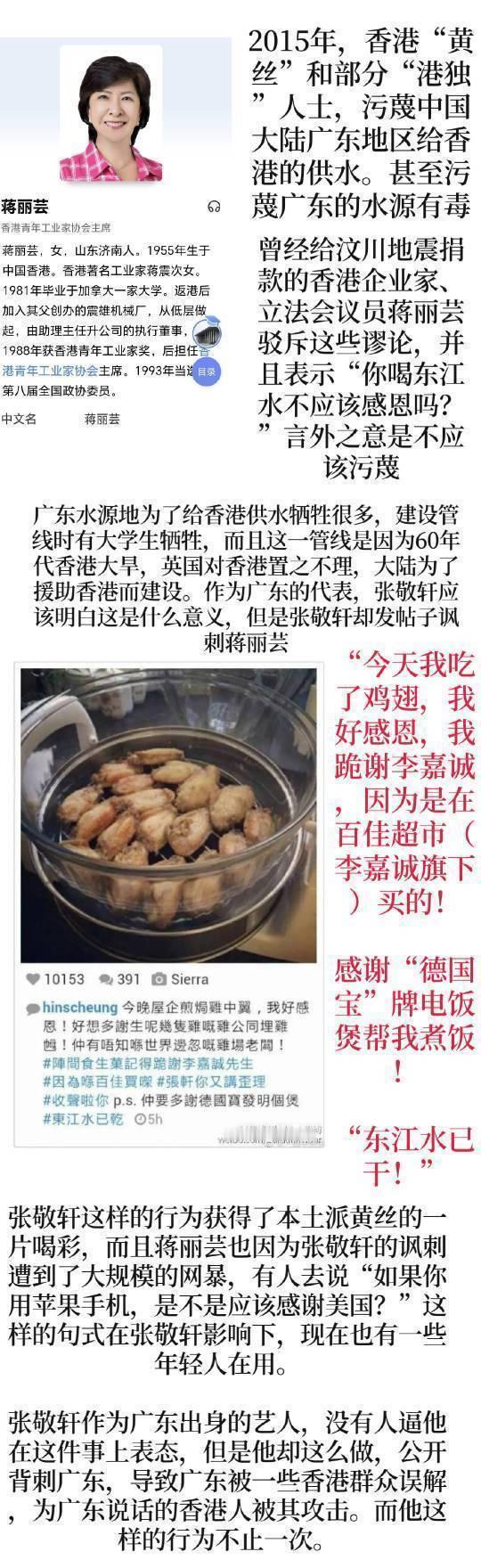 张敬轩曾经表示,自己是无根的水生植物,香港人不认,广东人也不认。 “一次回广州演出,他看见横幅上写着欢迎香港著名歌星张敬轩,那一刹那,他觉得自己像无根的水生植物。香港人还不认他,广州人也不认他了。” 关键王菲,刘嘉玲,黎明都没有他这么矫情,不管是被称作香港明星还是被称作内地明星,都泰然处之。王菲一直根在北京,没有因为拿了香港身份证有什么不适感。他们也没有背刺内地。 实际上张敬轩发表不当言论之前,很多老家人还是认他的。后面他自己作死才两头不靠了。