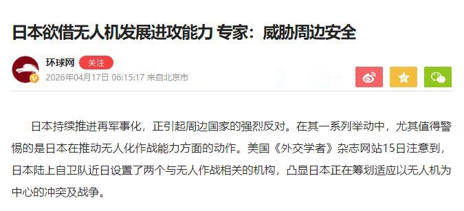 日本最近是真不老实,一步步挑战周边国家的底线! 尤其是在无人机上的动作,明摆着要搞能打仗的进攻性力量,专家都警告了,这已经严重威胁到咱们周边的安全。可能有人会说,无人机不就是拍拍照、送快递的吗?能有啥危害? 其实压根不是一回事,日本现在搞的无人机,全是用来打仗的,还偷偷想把导弹装上去,野心大得很。 先给大家说重点:日本这些年一直在偷偷加强军事力量,也就是大家说的再军事化,已经惹得周边国家都很不满、强烈反对。 最该警惕的就是它搞无人机作战,美国《外交学者》杂志4月15日就报道,日本陆上自卫队刚设了两个和无人机打仗相关的机构,说白了就是在准备以后打一场靠无人机的战争。 4月16日中国专家也说了,日本正琢磨着把先进导弹和便宜无人机凑一起,就是为了提升进攻能力,这不仅违反了它自己的“和平宪法”,对咱们周边的和平安全,也造成了实实在在的威胁。 可能很多中老年人不知道,二战结束后,日本因为发动战争闯了大祸,签了“和平宪法”,里面明确规定,日本不能有进攻性军事力量,只能搞自卫。 但这些年,它就没老实过,一点点突破限制,从多花钱搞军费、研发先进武器,到现在重点搞无人机打仗,每一步都在试探底线,还越来越明目张胆。 咱们说说它在无人机上的具体动作,全是真事,不是瞎编的。根据日本防卫省公布的文件,2025年3月它就有了近程、中程两种无人机,7月份还搞了能运东西到岸边军舰的无人机测试,甚至还参加了国际上的海上无人机演习。 更让人警惕的是,它还计划买多种小型攻击无人机,有的能打地面车辆,有的能打军舰,远中近射程都有,就是想全方位提升无人机的进攻本事。 而且它不光买、测试无人机,还专门设了两个相关机构,不是随便摆样子的,就是专门管无人机打仗的事,培养操作人员、制定作战方案,说白了就是为以后用无人机打仗做准备,美国媒体都看明白了,特意发文说它这是在准备打无人机战争,野心藏不住了。 最危险的就是,它要把导弹和无人机整合起来。无人机便宜,能多造,还不容易被发现,装上导弹就能偷偷摸摸攻击目标,杀伤力还不小。 日本现在还在搞先进导弹,计划2025年完成升级型反舰导弹研发,还会接收美国的“战斧”巡航导弹,这些导弹射程远,配上无人机,进攻能力就更厉害了。 有人可能问,日本为啥非要搞这个?说白了就是想摆脱二战后的约束,当军事大国。它天天喊“周边不安全”,其实就是给涨军费、搞武器找借口。 2026年军费超过9万亿日元,4年涨了3.6万亿,比花在老百姓养老、育儿上的钱还多,日本老百姓都骂这是“减寿大军扩”,为了搞军事,牺牲老百姓的福利。 还有就是美国在背后撑腰,纵容它搞军事,让它当自己在东亚的“打手”,日本也正好借这个机会,偷偷发展自己的进攻力量。 别觉得这和咱们没关系,咱们和日本是邻居,它搞进攻性武器,对咱们的安全肯定有威胁,韩国、俄罗斯也都很警惕。 二战时日本的侵略,大家都没忘,谁也不想再经历战争。日本是一步步来的,右翼势力还在扩张,军国主义有死灰复燃的危险,专家的警告不是危言耸听。 说到底,日本借无人机搞进攻,就是想突破和平宪法,搞军事扩张,伤害周边国家感情,威胁地区安全。 希望它能认清形势,反省历史,别再挑战底线,不然迟早自食恶果,和平来得不容易,谁也不能破坏。