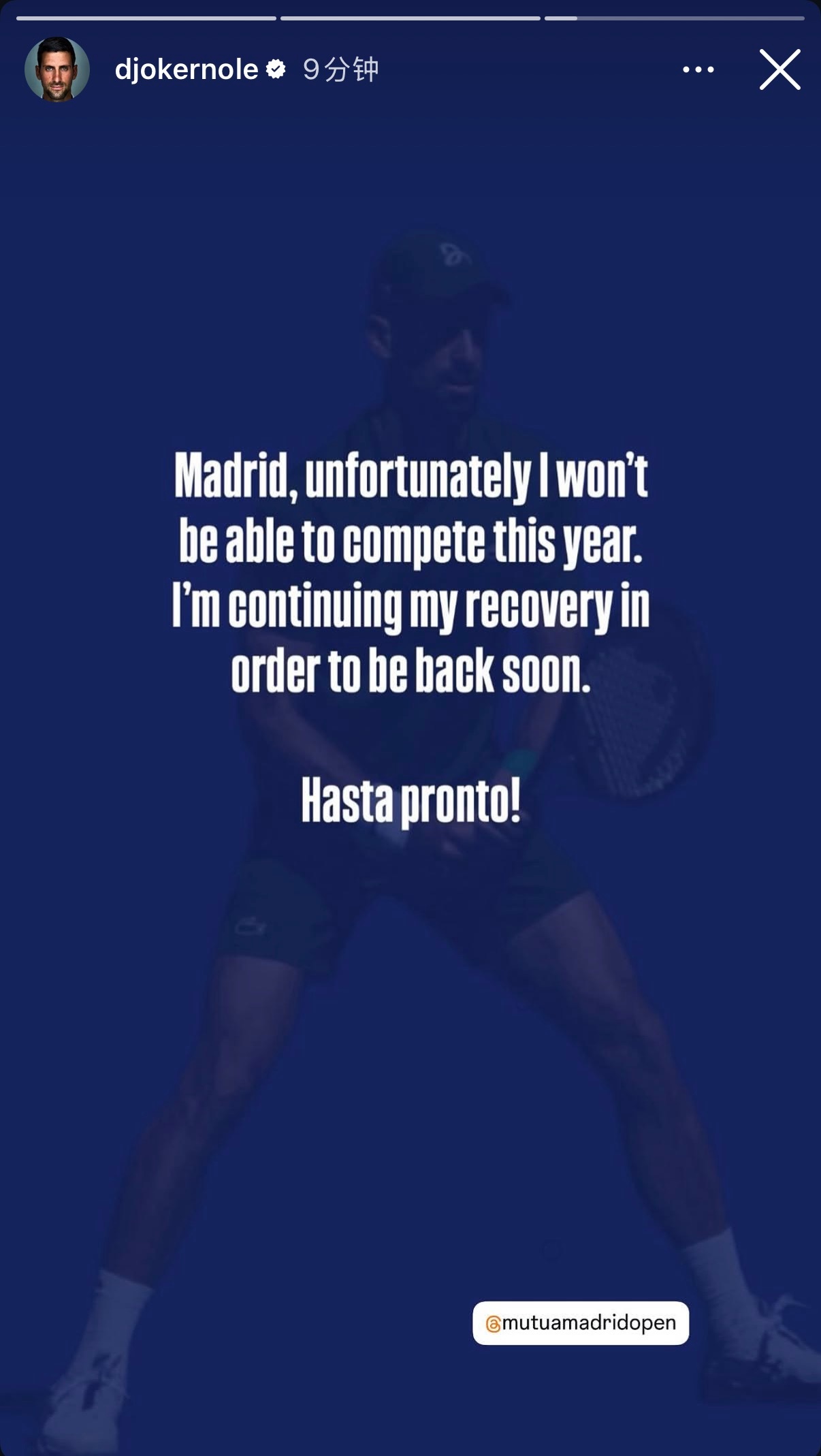 德约宣布退出马德里大师赛,继续康复,以尽快重返赛场。