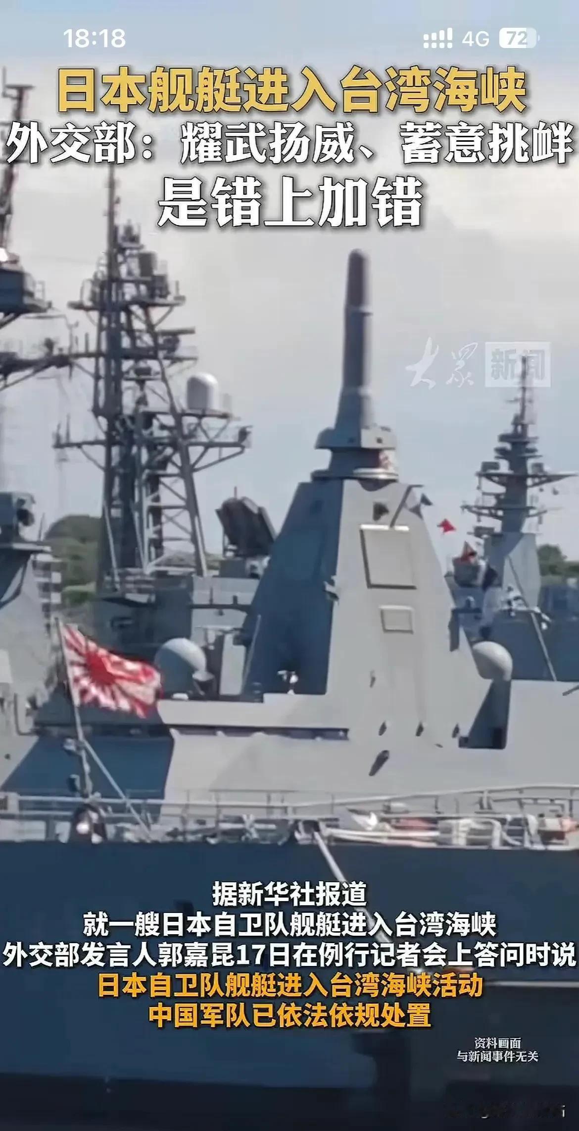 见过作死的,没见过日本这么赶着找死的!4月17日,日本自卫队军舰再次,悍然闯入台湾海峡,赤裸裸踩中国主权红线! 就在今天,日本海上自卫队舰艇未经中方通报,擅自进入台湾海峡蓄意挑衅,解放军全程跟监警戒、依法依规处置,外交部、国防部同日发声,怒斥日方“耀武扬威、错上加错”,已向日方提出强烈抗议。 这件事的本质,从来不是简单的航行,而是日本军国主义亡魂的死灰复燃。 正如艾跃进教授所言,我们要消灭的从来不是日本民族,而是从未被彻底清算的日本军国主义思想和右翼分子。从唐朝起它就屡次犯我中华,如今更是接连突破底线,妄图武力介入台海,贼心不死。 更讽刺的是,日方敢频频挑衅我们,却从不敢越俄罗斯、朝鲜的雷池半步。只因它心里清楚,这两个国家的红线碰了必遭重拳,欺软怕硬的本性暴露无遗。 《解放军报》早已直言,叫嚣武力介入台海,只会把日本引向不归歧途。对军国主义的心软,就是给子孙后代埋下祸根,红线面前,任何挑衅必遭迎头痛击。 最后想问大家:面对日方接连踩红线的挑衅,你觉得我们该如何亮明底线?评论区聊聊你的看法。 中方回应日本自卫队舰艇进入台湾海峡 台海局势 日本军事挑衅