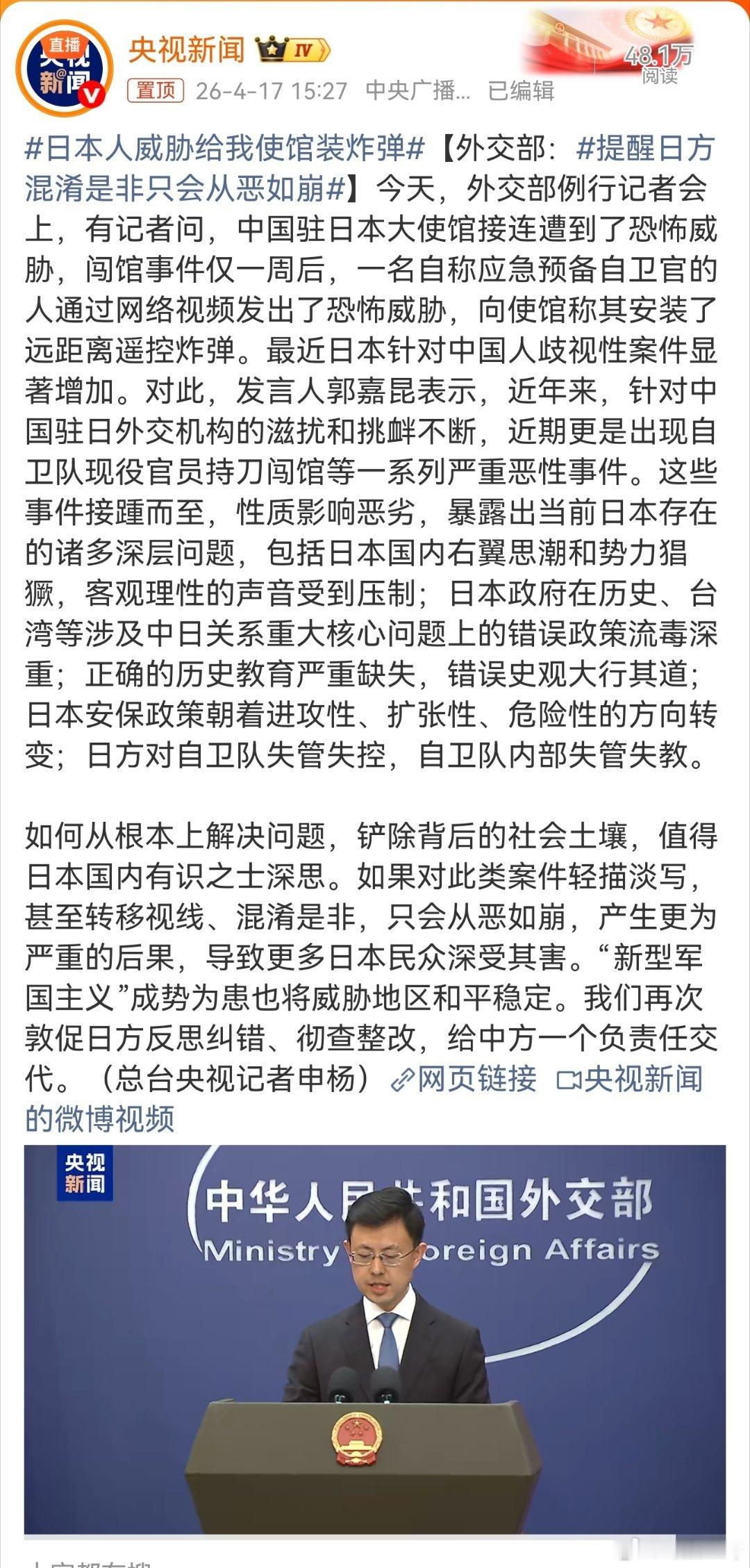 说实话,现在的日本不断挑战我们的底线!高市早苗叫嚣干涉台湾,部署远程攻击导弹,持刀闯大使馆,军舰过台海,威胁给史馆装炸弹……