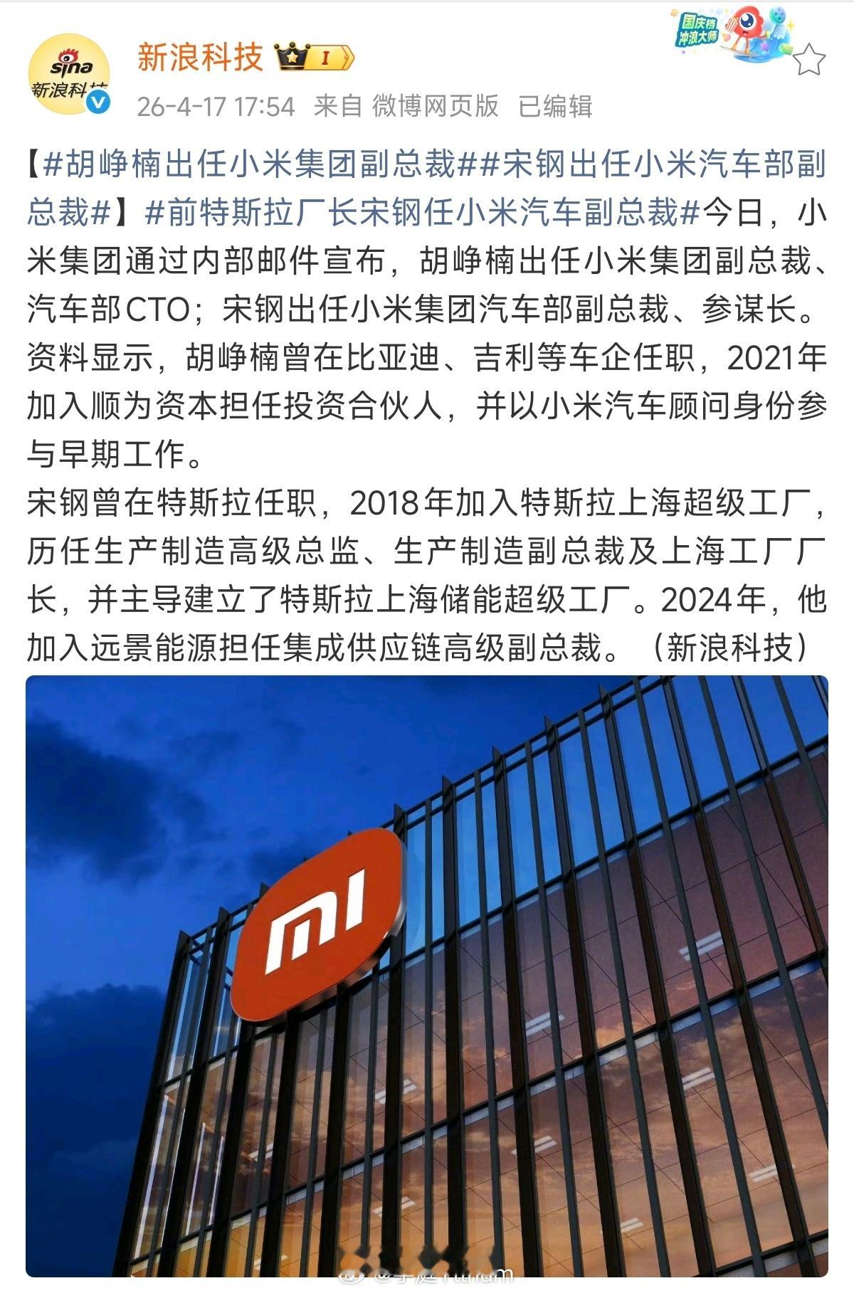 胡峥楠出任小米集团副总裁小米汽车战舰了说是 沈阳