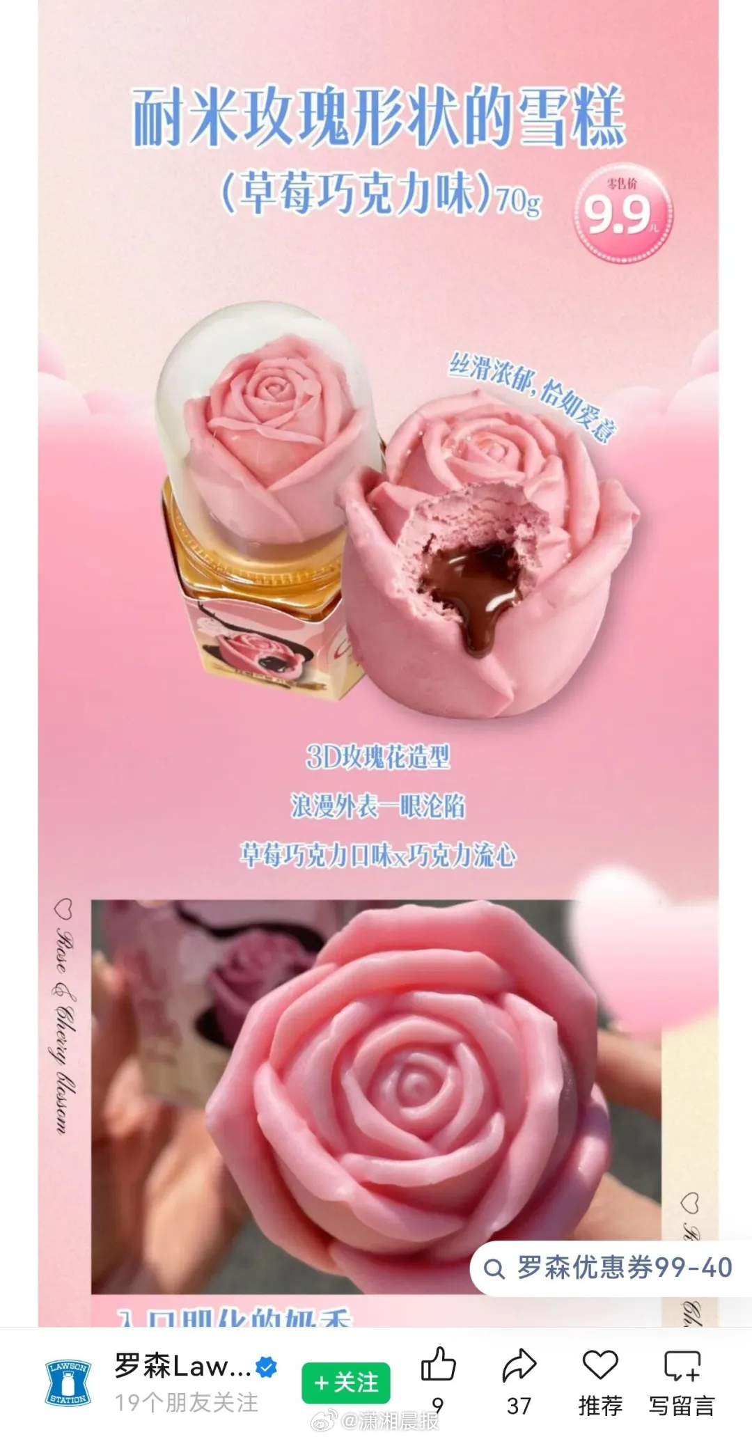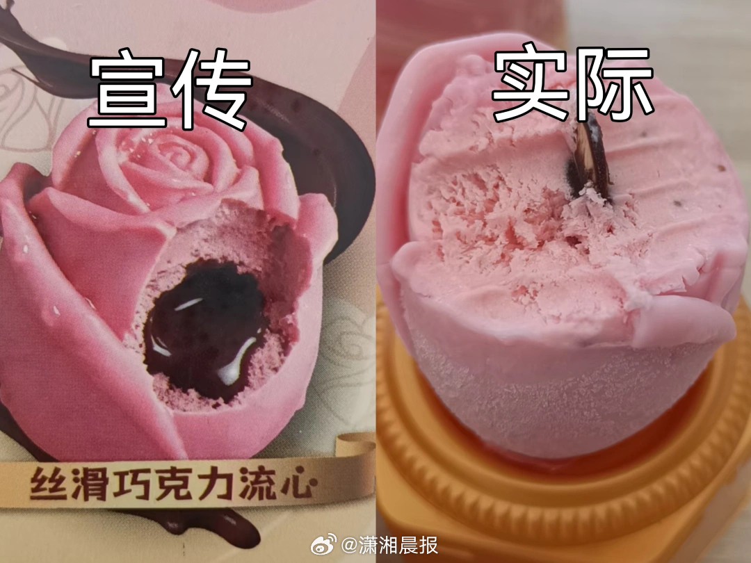 【#女子买流心雪糕流心小到像颗瓜子#,#罗森回应雪糕的流心小到像颗瓜子#:目前已不再销售】商品外包装上,粉色的玫瑰花造型,里面是浓郁欲滴的巧克力流心。但消费者买了一尝,发现巧克力仅薄薄一层,裹在雪糕棍上。近日,消费者小哇(化名)在网上分享了自己被巧克力流心雪糕背刺的经历,引发网友关注。