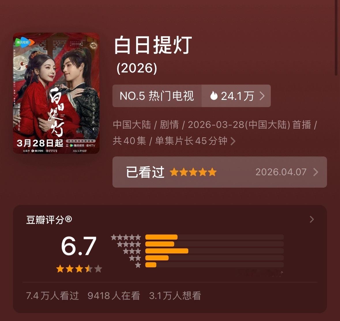 迪丽热巴《白日提灯》豆瓣开分6.7海外IMDb 8.1 (以专业、严谨著称)腾讯站内 9.6 (70万观众打分)豆瓣嘛,手搓不过机器系列,习惯了…