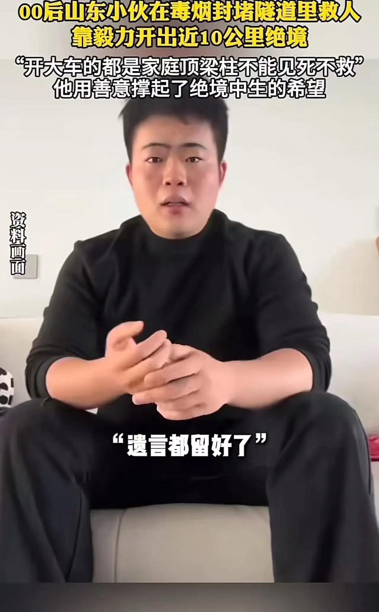 “遗言都留好了。我有可能出不去了。”4月13日,“00后”山东icon小伙在毒烟封堵的隧道里勇救货车司机,摸黑开车近10公里,绝境救人!事后小伙的一句话,令人泪目!网友:他给妈妈说遗言的时候,妈妈该多担心啊! 00后山东小伙隧道绝境救人,留遗言摸黑驾车10公里:这才是中国青年该有的模样 “遗言都留好了。我有可能出不去了。” 一句平静到让人心头发紧的话,出自一位00后山东小伙之口。4月13日,一场惊心动魄的隧道救援,让无数网友看完瞬间破防。没有豪言壮语,没有丝毫犹豫,在毒烟弥漫、视线全无、生死未卜的绝境里,这个年轻的小伙子,用自己的勇敢和担当,硬生生从死神手里抢回一条生命。 事发隧道内,货车突发事故,浓烟滚滚,有毒气体迅速充斥整个空间。能见度几乎为零,人一旦吸入,轻则窒息昏迷,重则危及生命。被困司机命悬一线,呼救声都被浓烟与黑暗吞噬,换做常人,早已吓得转身逃离,保命要紧。可这位00后小伙,没有丝毫退缩。 他明知前方是九死一生的险境,浓烟呛得人睁不开眼、喘不上气,每多待一秒,就多一分危险。可他还是义无反顾冲了进去,在漆黑一片的隧道里,凭着模糊的判断和求生救人的执念,摸索着找到被困司机。那一刻,他不是不怕死,而是在他人的生命面前,把自己的安危放在了后面。 更让人揪心又敬佩的是,在绝境之中,他还不忘给家人留下遗言。一句“我有可能出不去了”,道尽了当时的凶险,也藏着一个年轻人对母亲最深的牵挂。他知道前路凶险,甚至做好了再也走不出去的准备,可即便如此,他依旧没有放弃救援。 在毒烟封堵、视线完全受阻的情况下,他硬是摸黑驾驶车辆,带着被困司机在隧道里前行近10公里。这10公里,每一米都走在生死边缘。没有灯光指引,没有清晰路况,只有刺鼻的浓烟和随时可能发生的危险。他凭借着过人的胆识和冷静的判断,硬生生闯出一条生路,成功将人救出险境。 事后,小伙的这段经历被曝光,那句留给家人的遗言,瞬间戳中无数网友的泪点。大家纷纷感慨:他给妈妈说遗言的时候,妈妈该多担心啊!一个还未褪去青涩的00后,在生死关头,没有考虑自己,先想到的是救人,甚至坦然面对可能到来的死亡,这份勇气,远超很多成年人。 有人说,现在的年轻人娇生惯养,吃不了苦、担不了事。可这位山东00后小伙,用行动狠狠打破了偏见。他没有身披铠甲,没有超人能力,只是一个普普通通的年轻人,却在危难时刻,扛起了不属于这个年纪的责任与担当。他的勇敢,不是一时冲动,而是刻在骨子里的善良;他的抉择,不是毫无畏惧,而是明知危险,依旧选择挺身而出。 隧道里的浓烟会散去,但这份温暖与勇敢,永远留在人们心中。在这个浮躁的社会,太多人习惯了明哲保身,遇事第一反应是自保,可总有人愿意在黑暗中逆行,在绝境中伸手。这位00后山东小伙,用一次生死救援,诠释了什么叫善良,什么叫担当,什么叫中国人刻在骨子里的热血。 他也是父母捧在手心里的孩子,也会害怕死亡,也有牵挂的家人。可在他人生命垂危的瞬间,他放下了恐惧,扛起了责任。那句遗言,是对家人的不舍,更是对生命的敬畏。没有惊天动地的壮举,只有平凡人的挺身而出,却足以让所有人肃然起敬。 这才是新时代青年最好的样子,不卑不亢,勇敢善良,在危难面前不退缩,在生死面前有担当。山东小伙用行动证明,00后早已长大,他们能扛事、敢担当,是值得信赖的一代。 愿每一份善良都不被辜负,愿每一次逆行都平安归来。为这位00后山东小伙点赞,他是真正的平民英雄,是这个时代最闪亮的光!救人青年 00后勇敢救人
