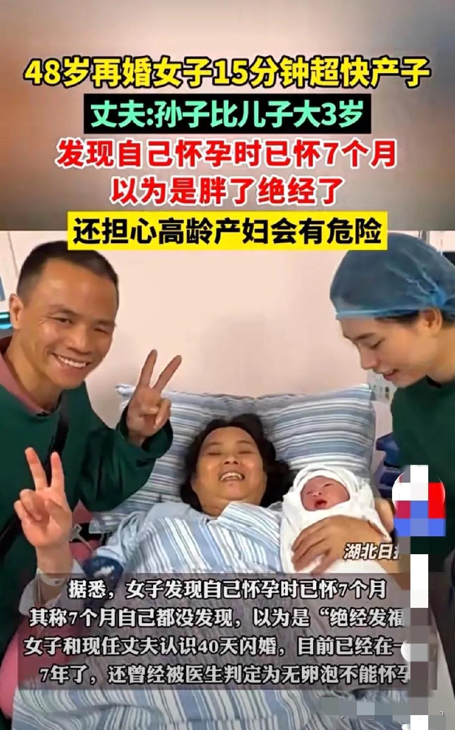 太离谱了!广东河源,48岁二婚女子发现肚子变大,她以为是胖了,结果一检查,才知道自己已经怀孕7个月了,这让她感到很惶恐,她的女儿都已经28岁了,平时都有做措施,怎么就怀孕了,没办法,只能生了!结果,她居然15分钟超快顺产了男孩!当事人丈夫:孙子比儿子大3岁! 48岁的年纪,又身处二婚状态,女子本就没有再生育的打算,日常也做好了避孕防护,肚子出现变大的迹象时,她第一时间认定是中年发胖,也是再正常不过的反应。 步入中年后,身体代谢速度放缓,腹部脂肪容易堆积,加上没有明显的孕期反应,她根本没有往怀孕的方向考量,这份认知偏差,也是她迟迟没能发现怀孕的核心原因。 得知怀孕7个月的检查结果时,她的惶恐情绪完全是真实且合理的。48岁早已超出黄金生育年龄,属于医学层面明确的高龄产妇,这个阶段怀孕,要面对的妊娠高血压、妊娠糖尿病等并发症风险 会比年轻产妇高出数倍,生产过程中也会面临更多不可预知的危险。没有任何孕期准备,突然要直面高龄生育的重重风险,换做任何人,都会陷入难以平复的慌乱之中。 更让她心绪难平的是家庭代际的尴尬,女儿已经28岁,早已组建自己的家庭,自己却要在这个年纪生育孩子,往后家庭里的辈分关系会变得极为特殊,这种世俗层面的顾虑,也让她背负了额外的心理压力。明明做好了周全的避孕措施,却依旧出现意外怀孕的情况,这份无法掌控的意外,更是加重了她的无助感。 怀孕7个月已经进入孕晚期,此时强行终止妊娠,对女性身体的损伤极大,甚至会留下难以逆转的健康隐患,女子最终选择生下孩子,是权衡所有情况后的无奈之举,也是对自身健康和生命的负责。她没有更多选择的余地,只能硬着头皮迎接这个突如其来的小生命,即便清楚后续生活要面临无数难题,也只能选择接受。 15分钟超快顺产的结果,完全超出了所有人的预期。高龄产妇的顺产难度本就远高于普通产妇,盆底肌功能、子宫收缩能力都有所下降,多数高龄产妇都会面临产程过长、生产费力的问题,甚至需要通过剖腹产完成分娩。女子能如此顺利完成顺产,全程没有出现高危状况,离不开自身常年较好的身体素质,这也是这场意外中,最值得庆幸的事情。 丈夫那句“孙子比儿子大3岁”的感慨,直白道出了这个家庭最特殊的地方,也让这件事迅速引发大众广泛讨论。 28岁的女儿早已生育孩子,新生的幼子比外孙还要年幼三岁,这样的辈分结构在日常生活中极为少见,彻底打破了大众对家庭代际关系的常规认知,也让这个普通家庭,不得不面对全新的生活格局。 中年得子看似是一件喜事,背后却藏着实打实的现实压力。女子和丈夫都已步入中年,体力和精力都远不如年轻时期,重新回归照料婴幼儿的生活,要应对昼夜不停的喂养、哭闹、陪护等琐碎事务,身体的消耗和劳累程度可想而知。经济层面也要重新做出规划,孩子的养育、教育等长期支出,会给中年家庭带来新的经济负担,原本安稳的中年生活节奏,被彻底打乱。 家人的心态也经历了一段复杂的转变过程,28岁的女儿面对比自己孩子还小的弟弟,初期难免会有难以适应的情绪,年龄差距过于悬殊,让她一时间无法接受姐弟身份的转变。但随着孩子顺利降生,血脉亲情的牵绊,让家人慢慢放下了心理隔阂,开始学着接纳这个新成员,共同承担起照料的责任。 这件事也给中年群体敲响了警钟,即便做好避孕措施,也不存在百分百的避孕成功率,中年夫妻依旧不能抱有侥幸心理。处于这个年龄段的女性,更要时刻关注自身身体变化,出现异常体征时及时就医检查,避免出现怀孕数月却浑然不知的情况,减少高龄怀孕带来的健康风险。 外界不必对这个家庭的特殊辈分过度调侃,每一个高龄产妇的选择,都承担着常人难以想象的身心压力,中年育儿的艰辛,也只有当事人能够体会。生命的到来本就充满不可预知的意外,一家人愿意共同扛起生活的重担,用心守护新生命,这份态度就值得尊重。 中年迎来意外子嗣,是惊喜也是考验,往后的生活虽要面对诸多不易,但只要一家人同心协力,慢慢适配新的生活节奏,总能一步步克服所有难题,把平凡的日子过好。