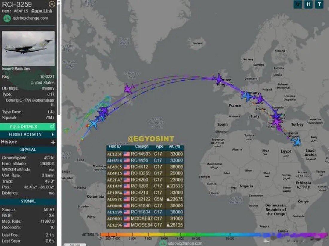 【美军向中东地区大规模增派运输机】据航迹追踪数据显示,美军近期向中东方向发起的战略空运活动显著增加。多架C-17“环球霸王III”及C-5M“超级银河”战略运输机正频繁穿梭于关键航线。此类重型运输机通常用于跨洲际快速部署部队、装甲车及关键物资。 中东局势以美袭击伊朗