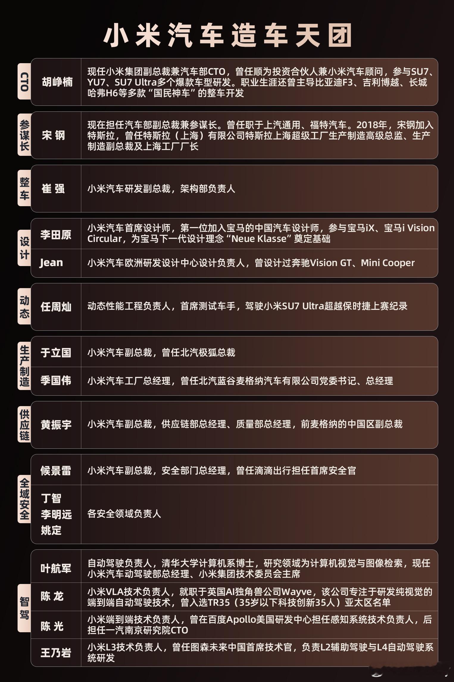 胡峥楠出任小米集团副总裁小米官宣了:胡峥楠出任小米集团副总裁、汽车部CTO,宋钢出任小米集团汽车部副总裁、参谋长!这是小米汽车成立以来首次设立CTO岗位。胡峥楠近三十年行业经验,参与了比亚迪F3、哈弗H6、吉利博越等明星产品,大家很熟悉的SU7发布会、纽北赛道也都有他身影。宋钢上汽通用福特出身,2018年以第一名员工身份加入特斯拉上海工厂,主导了从0到1的建设,被称作“王牌厂长”。