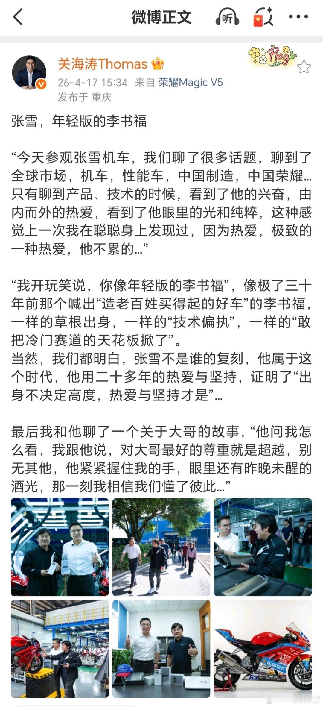 荣耀高管称张雪是年轻版的李书福有人说,李书福是“汽车狂人”,从摩托车硬闯出一条造车路。今天,荣耀高管说张雪是“年轻版的李书福”一样的草根出身,对技术一样的执着。
