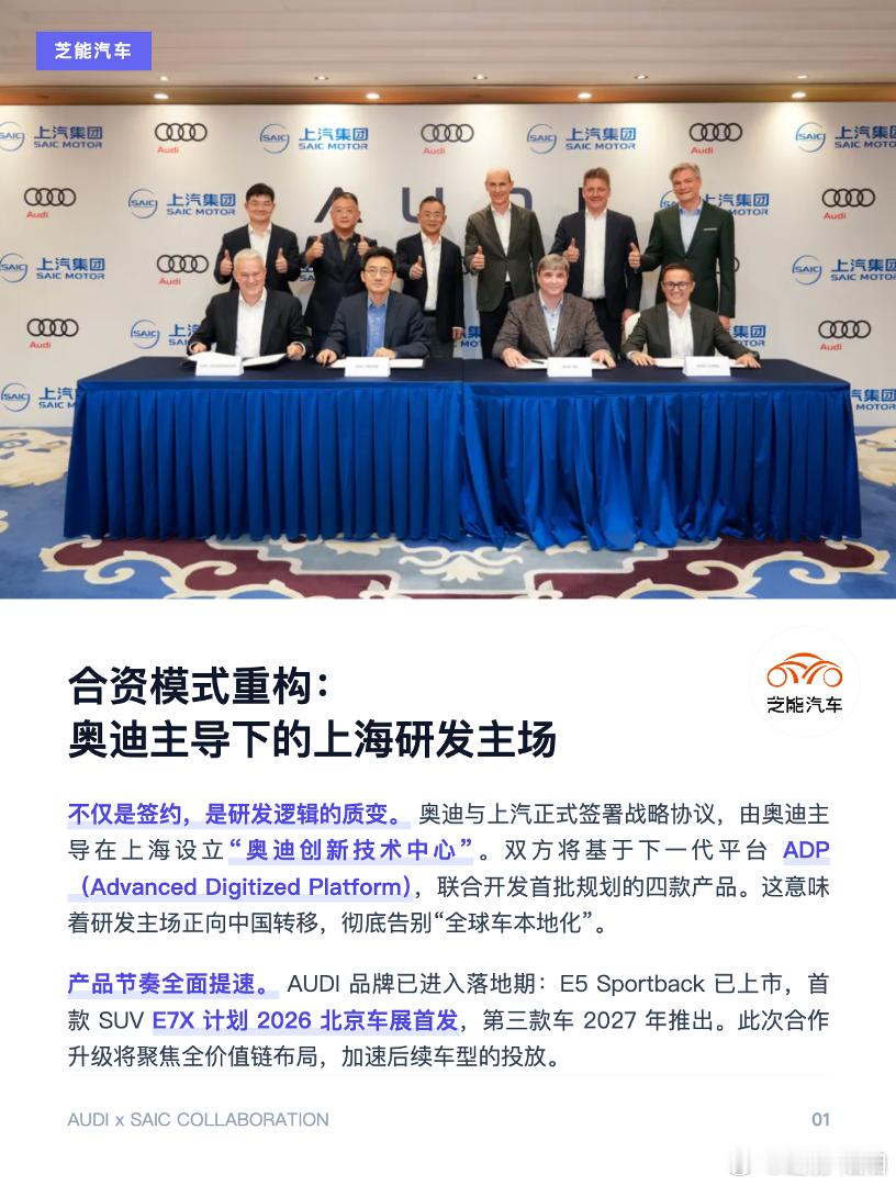 奥迪股份公司 与 上汽集团 正式签署深化战略合作协议,围绕全新新能源子品牌“AUDI品牌”推进下一阶段发展。双方将在上海设立“奥迪创新技术中心”,由奥迪主导,聚焦智能电动化与智能网联汽车(ICV)的整车研发。合作将基于下一代平台——Advanced Digitized Platform(ADP),联合开发未来车型,首批规划四款产品,预计在未来几年陆续进入中国市场,进一步扩展AUDI品牌产品矩阵。