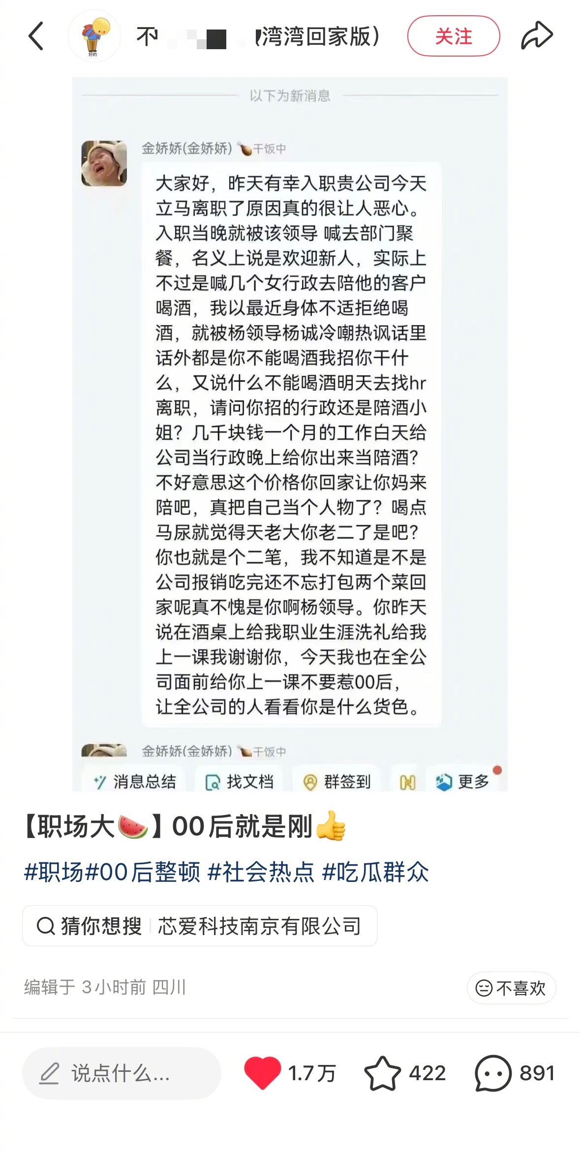 网传截图显示,在名为芯爱科技(南京)有限公司的内部群内,一名员工发长文称其“昨天刚入职,今天就离职”,原因是她被公司杨姓领导要求陪客户喝酒。该员工称,她以身体不适为由拒绝喝酒,却遭到杨姓领导冷嘲热讽,对方还暗示她不喝酒就离职。她因此愤而离职,并在公司全员群里公开指责该领导。