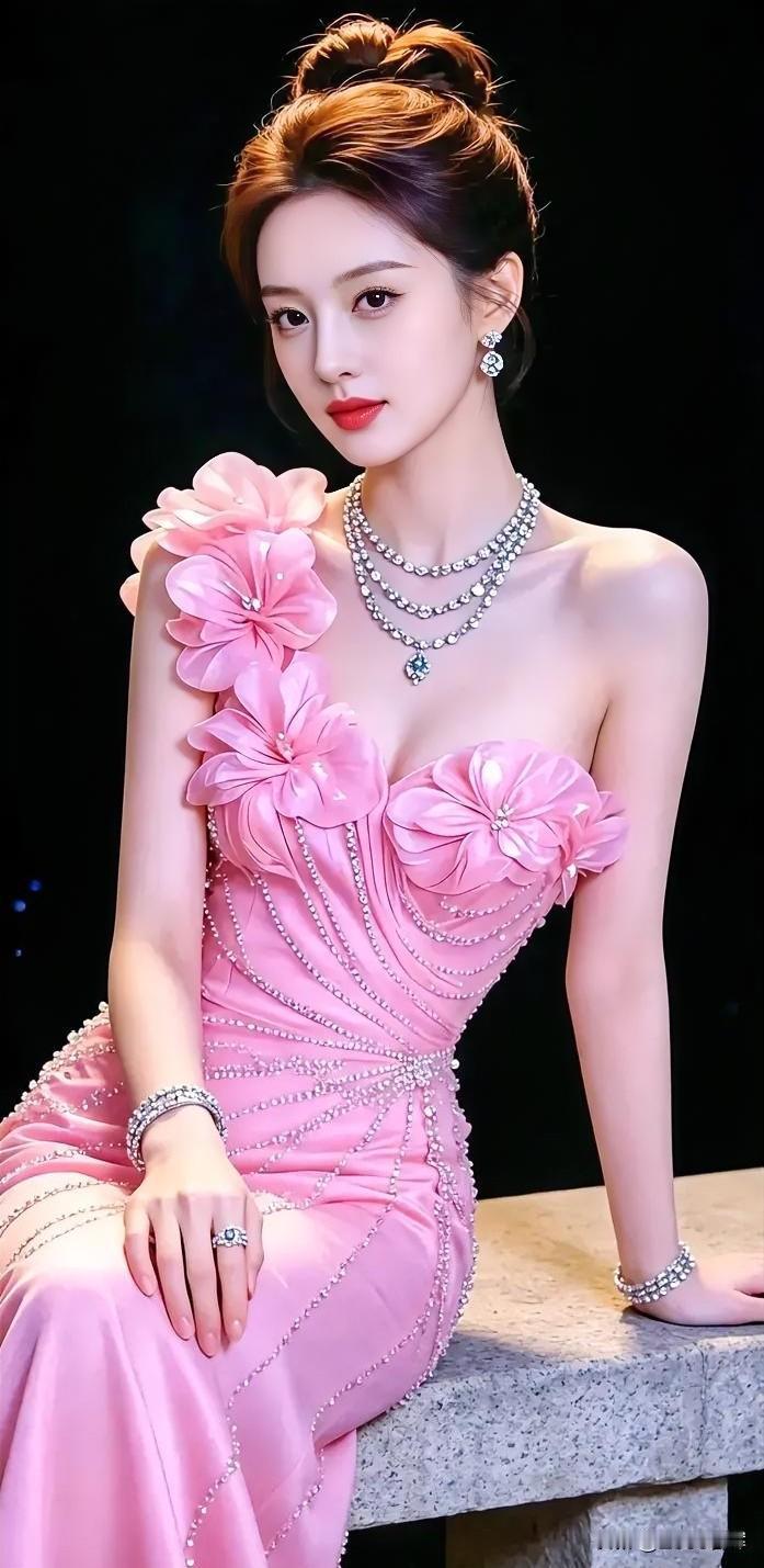 粉裙如霞,盛放肩头的花影摇曳。 珠链垂落,串起星光与温柔的私语。 她坐石上,姿态如古典雕塑般优雅。 发髻高挽,凝住岁月沉淀的从容。 红唇微启,似春日初绽的玫瑰瓣。 美在华丽间,是灵魂不褪的诗意华章。