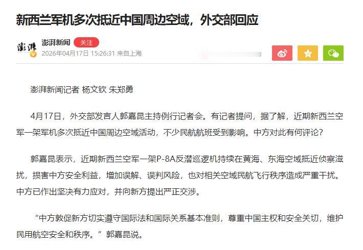 新西兰军机老往中国周边晃悠,外交部直接发话了! 4月17号外交部开了记者会,有记者问,最近新西兰空军有架军机,老往中国周边空域凑,都影响不少民航正常飞了,中方咋看? 外交部发言人郭嘉昆说得明明白白,没半点含糊:新西兰那架P-8A军机,一直在黄海、东海晃悠,近距离搞侦察,既损害咱们国家的安全,还容易闹误会、出意外,更耽误民航航班正常飞。 中方已经采取了有力措施,也严肃跟新西兰交涉了,还警告他们,必须守规矩,尊重中国的安全,别再影响民航飞行。 有人可能觉得,不就是一架军机飞过来,至于这么严肃吗?还有人没听过这架军机,不知道它来干啥。 这架军机叫P-8A,是美国造的,看着跟普通客机差不多,其实就是个专门打探消息的“间谍机”,带着先进设备,能查水下的潜艇,还能收集空中、海上的各种情报。 它不是偶然路过,是连着好几天反复往咱们周边凑,就是来打探消息的。 有人问,公海上空不能飞吗?能飞,但不能没规矩。国际法说公海上空能自由飞,但不能仗着这点自由,跑到别人家门口瞎晃、搞侦察。 黄海、东海是咱们的近海,关系到咱们的安全,新西兰军机跑到这来侦察,就跟有人在你家院门口来回晃、探头探脑一样,换谁都得警惕。 更可气的是,它这么晃悠,还耽误咱们坐飞机。咱们坐飞机,航线都是提前定好的,空域也分好区了,军机老在民航常用的空域晃,空中交通就变紧张,航班就得临时改路线、延误,不少乘客都受影响,这也是记者为啥要问这事——它真真切切影响到咱们普通人了。 还有人不明白,为啥说容易闹误会?空中飞机飞得快,有不明军机抵近,中方肯定要派战机去查看、监视,防止出意外。要是对方不按规矩来,突然靠近,很容易被当成挑衅,万一操作失误,后果就严重了,真不是小题大做。 再说中方的应对,郭嘉昆说的“坚决有力应对”,不是随口说说。别的国家军机擅自来家门口晃,咱们有权派战机去识别、警告、驱离,这是正当防卫,不违规、不挑衅,就是为了制止他们的不当行为,保护咱们的安全和民航秩序。 有人纳闷,新西兰离中国那么远,平时也没矛盾,为啥要来晃悠?其实很简单,新西兰是美国的盟友,美国这些年老往中国周边搞事,新西兰这次就是跟着美国凑热闹、刷存在感,纯属没事找事,压根没考虑咱们的安全。 大家也别担心会引发冲突,中方的应对很克制、很专业,就是想制止他们的不当行为,不是要挑事。 咱们的态度很明确:你不惹事,咱们就好好相处;你非要来家门口搞事,咱们绝对不会不管。 说到底,这事就是新西兰没事找事,派侦察机要打探咱们的消息,还耽误了民航。希望他们能听进去中方的警告,赶紧停止这种行为,好好守规矩,别再瞎掺和。 国家的安全跟咱们每个人都有关,中方绝不会让任何国家损害咱们的利益,只有国家安全,咱们的日子才能安稳。