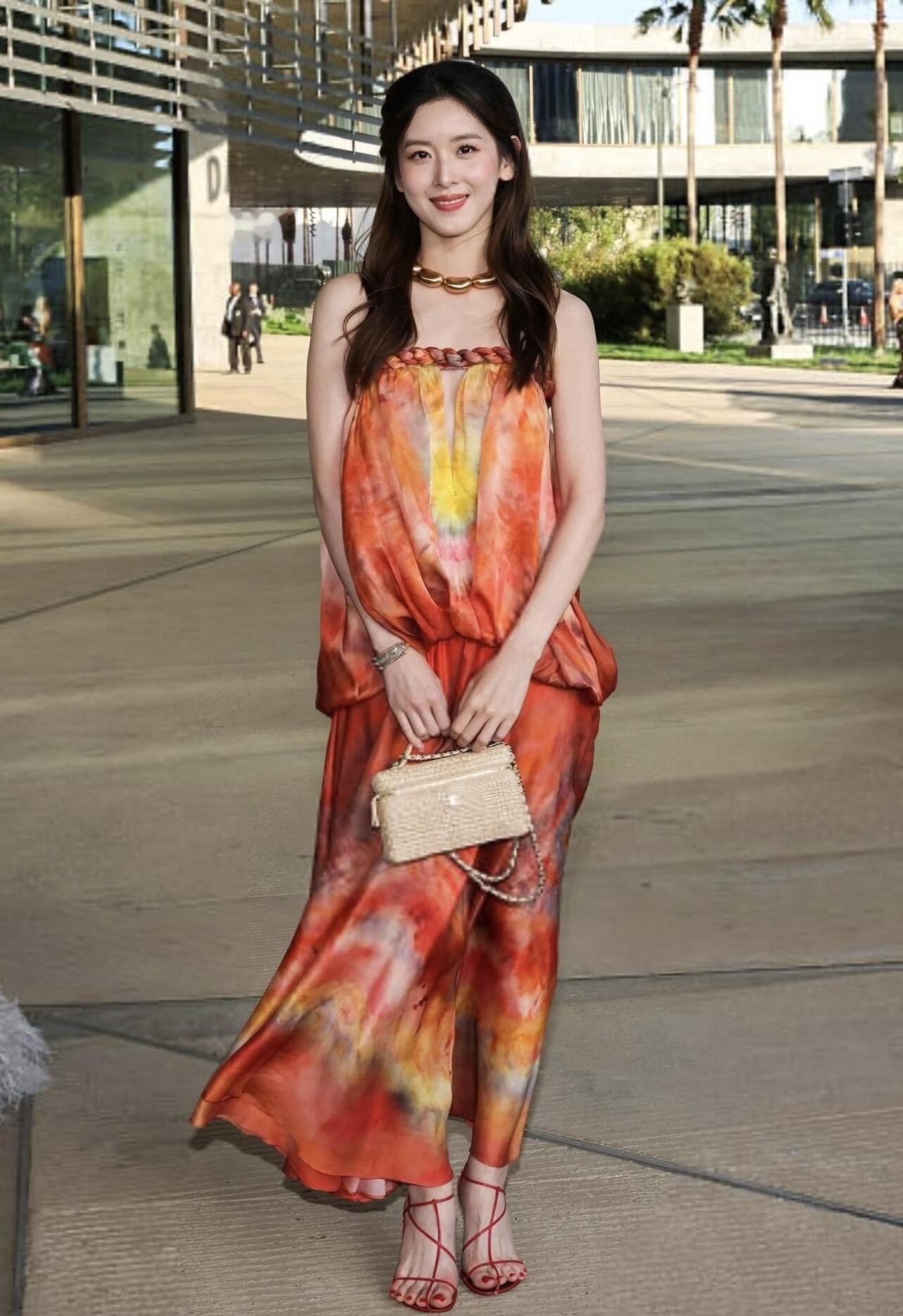 京东老板娘章泽天出席洛杉矶晚宴 照片中,章泽天妆容精致、衣着优雅,其造型随即在中国社交媒体上引发热议,并登上了热门话题榜。 照片显示,她身穿一袭饰有橙黄色花纹的彩色抹胸长裙,佩戴金色项链,留着精心打理的长发,面带自信的微笑。无论是特写镜头还是户外全身照,都展现出她优雅迷人的风采。