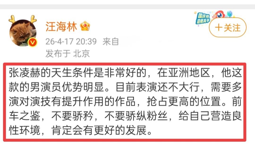 汪海林夸赞张凌赫。4月17号晚上8点多钟,编剧汪海林发文称,张凌赫的天生条件是非常好的,在亚洲地区优势明显。 汪海林给出了自己的建议:希望张凌赫在表演上下功夫,出好的作品。除此之外,汪海林还希望他要找到与粉丝的相处之道,以求更好地发展。