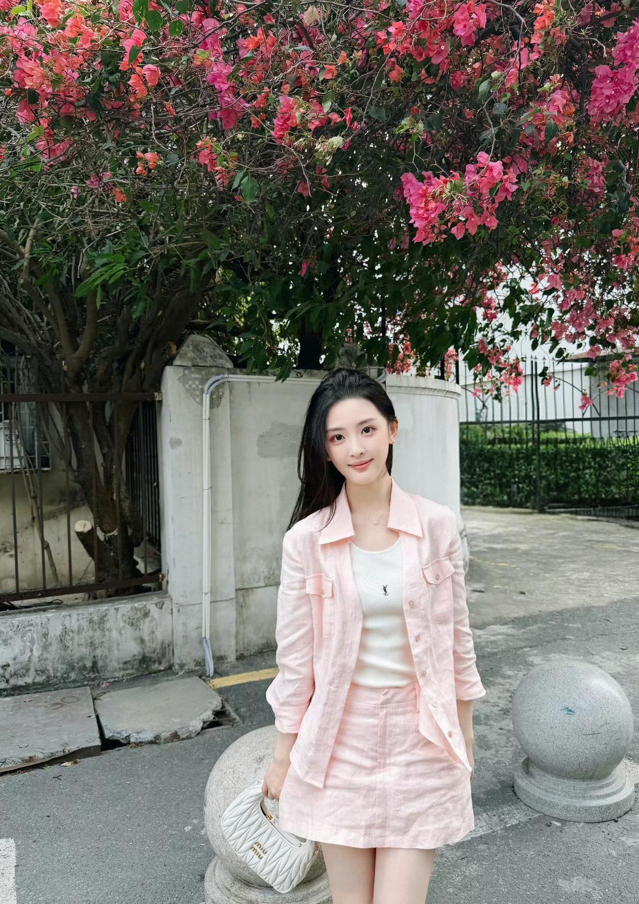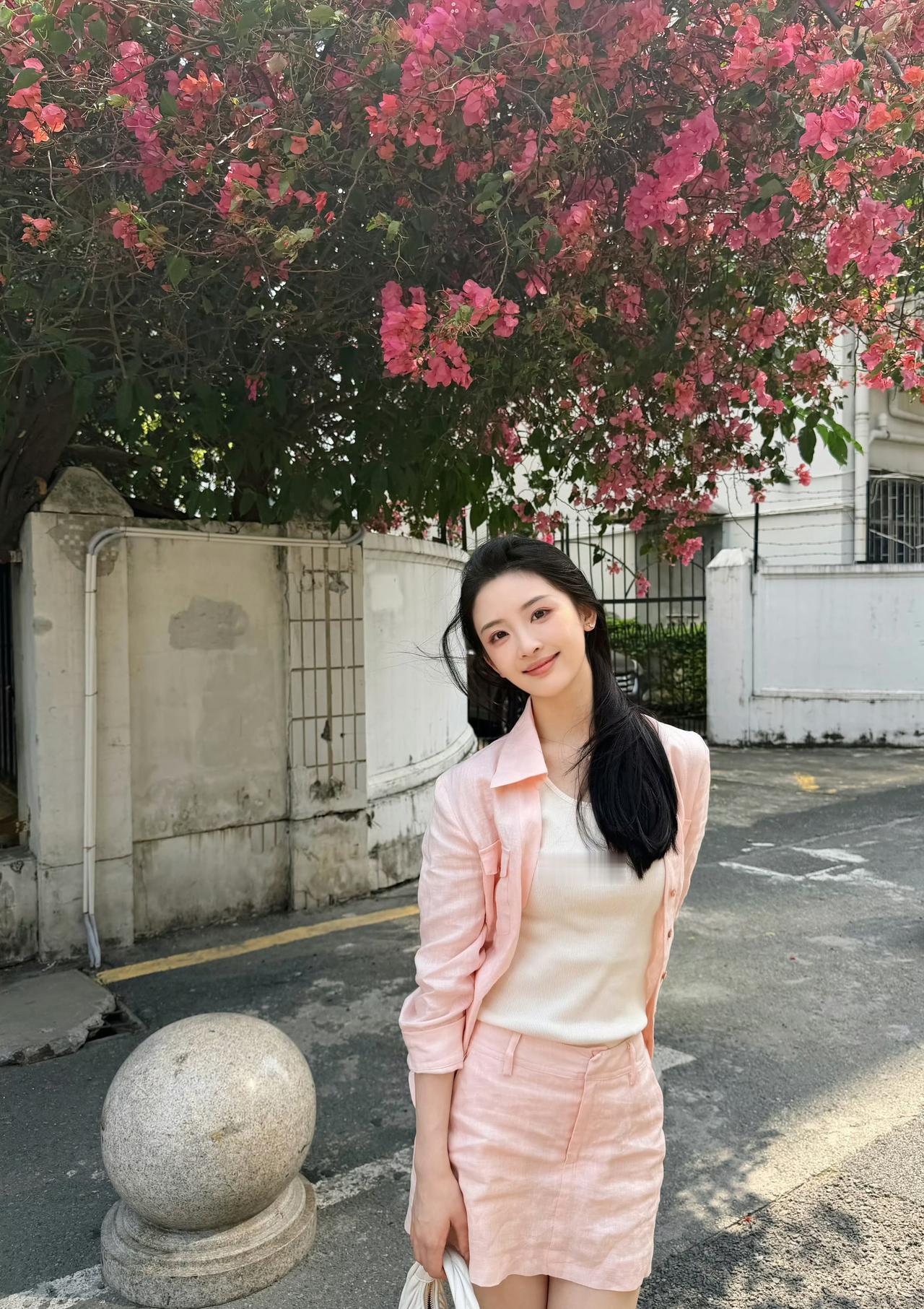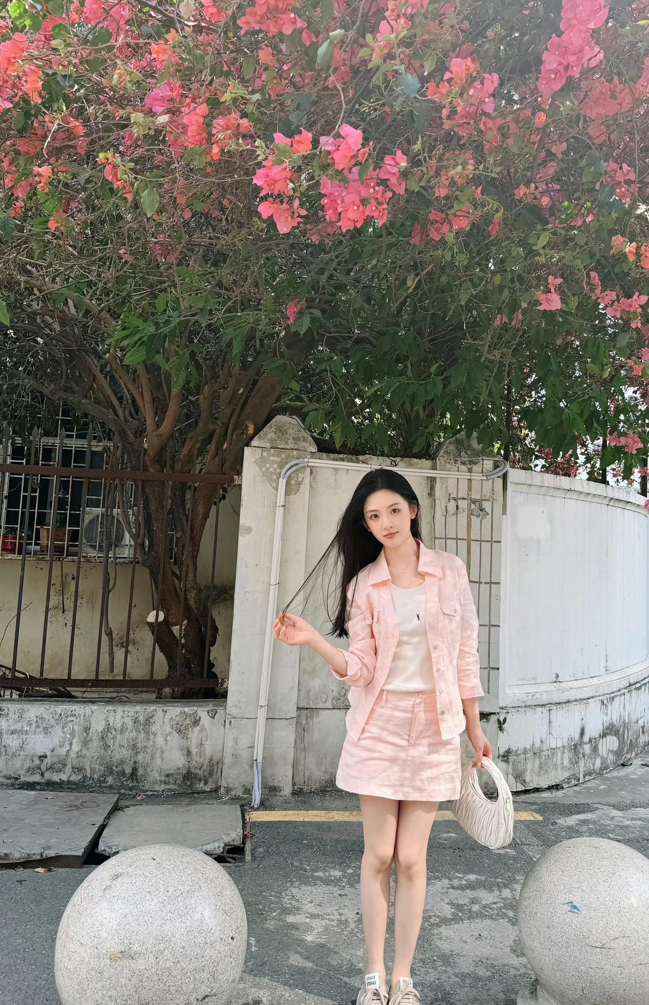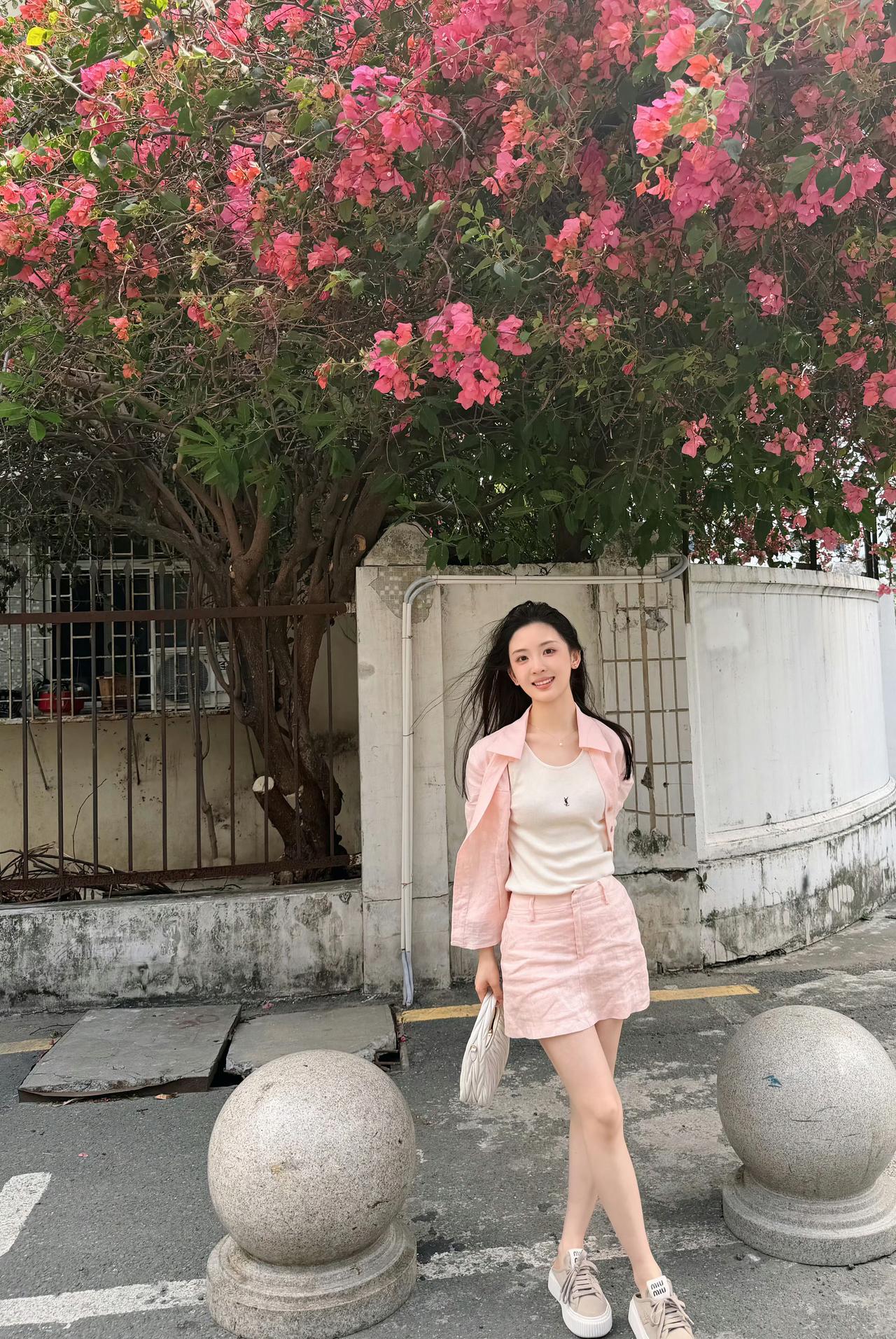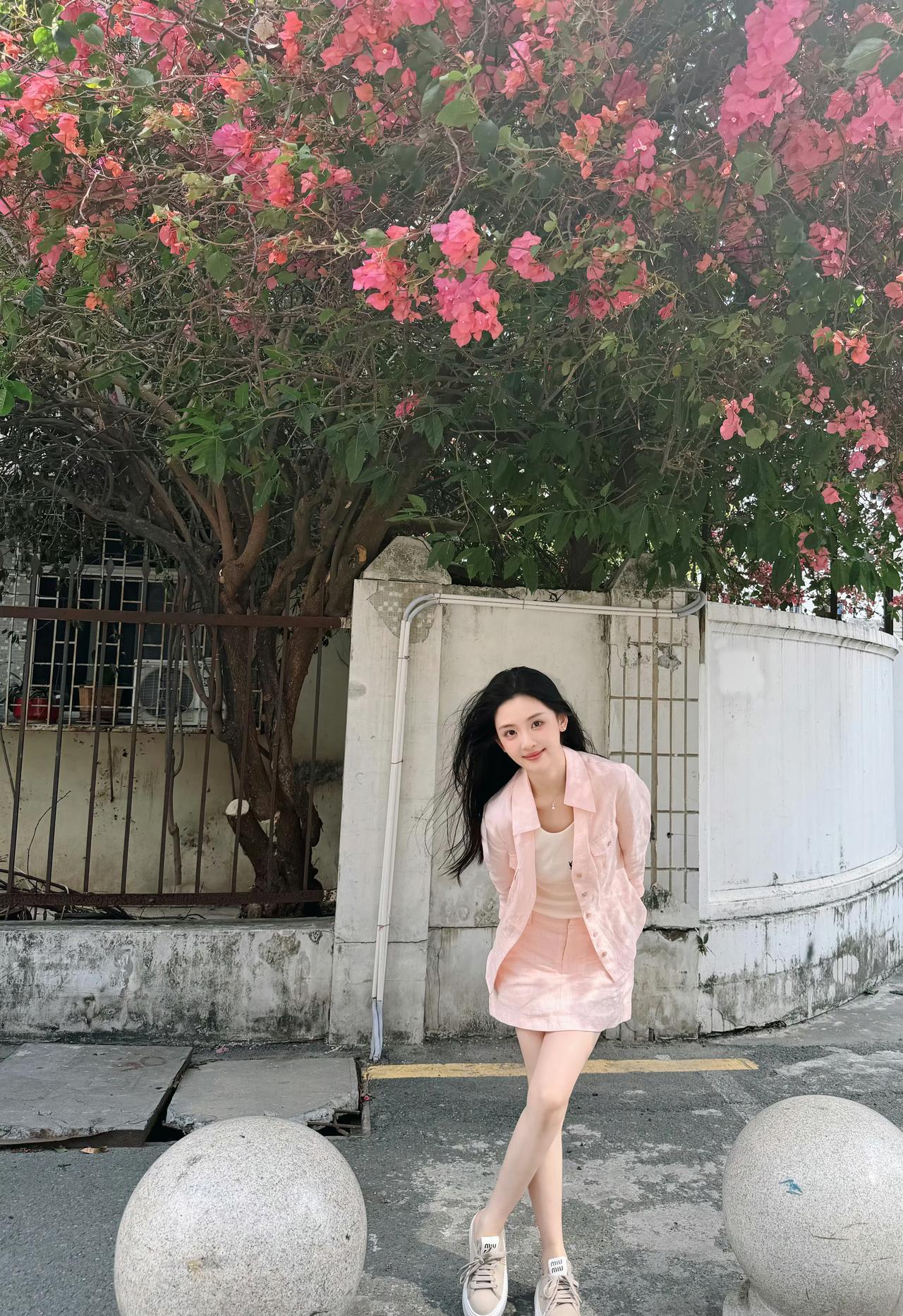 街角的三角梅泼洒着春日的热烈,一身浅粉套装,接住了满街的阳光与花香,风里都是松弛又清甜的气息。