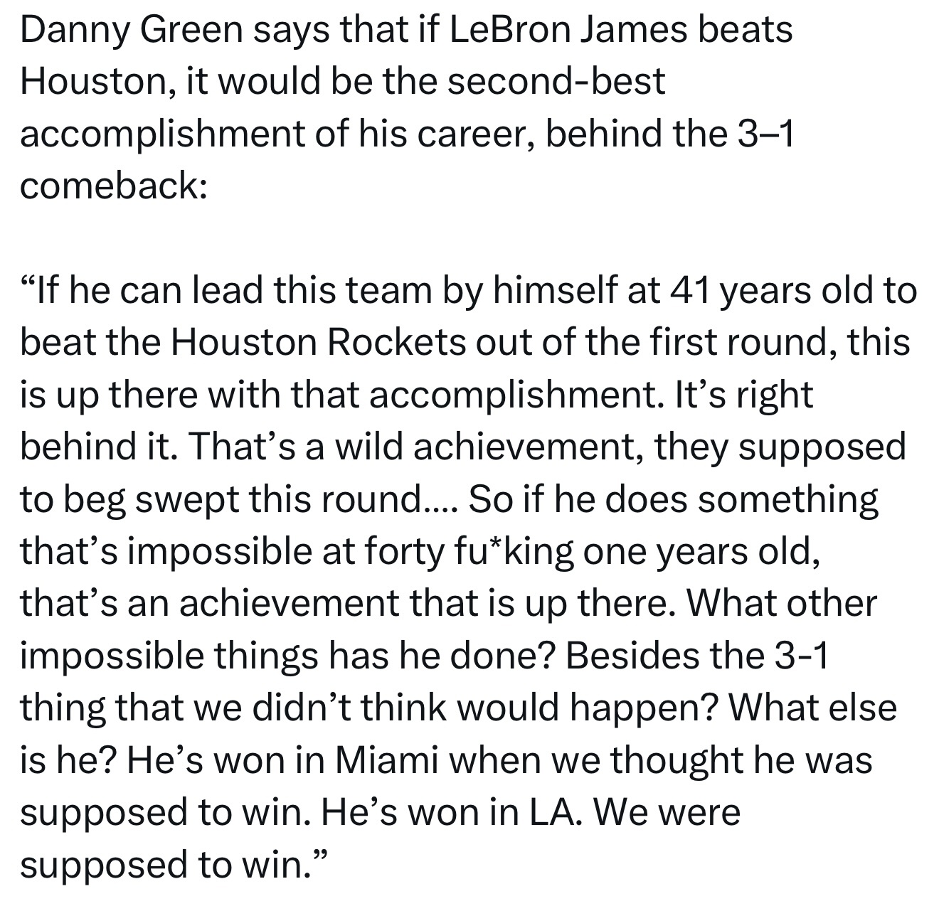 丹尼·格林表示,如果詹姆斯能在41岁的年纪带领球队击败火箭,那将是他生涯第二伟大的成就,仅次于2016年1-3逆转勇士夺冠: