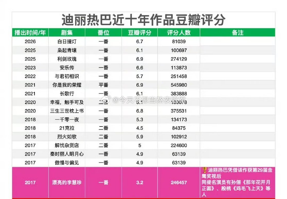 有网友发现,迪丽热巴近这几年的剧豆瓣评分都在6分上下,甚至分型也差不多。 同时《白日提灯》站内评分9.5,是700w人的看后评分,是鹅站内90🌸剧评分第一白日提灯有效播放超5.59亿