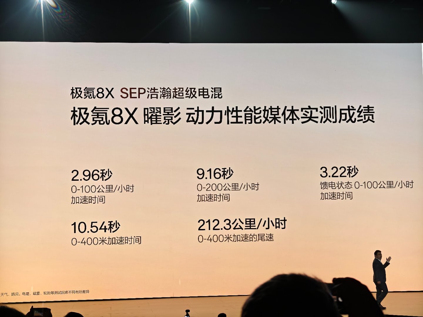 极氪8X 曜影 SEP浩翰超级电混 动力性能实测,百公里加速2.96秒、200公里加速9.16秒、馈电状态百公里加速3.22秒;