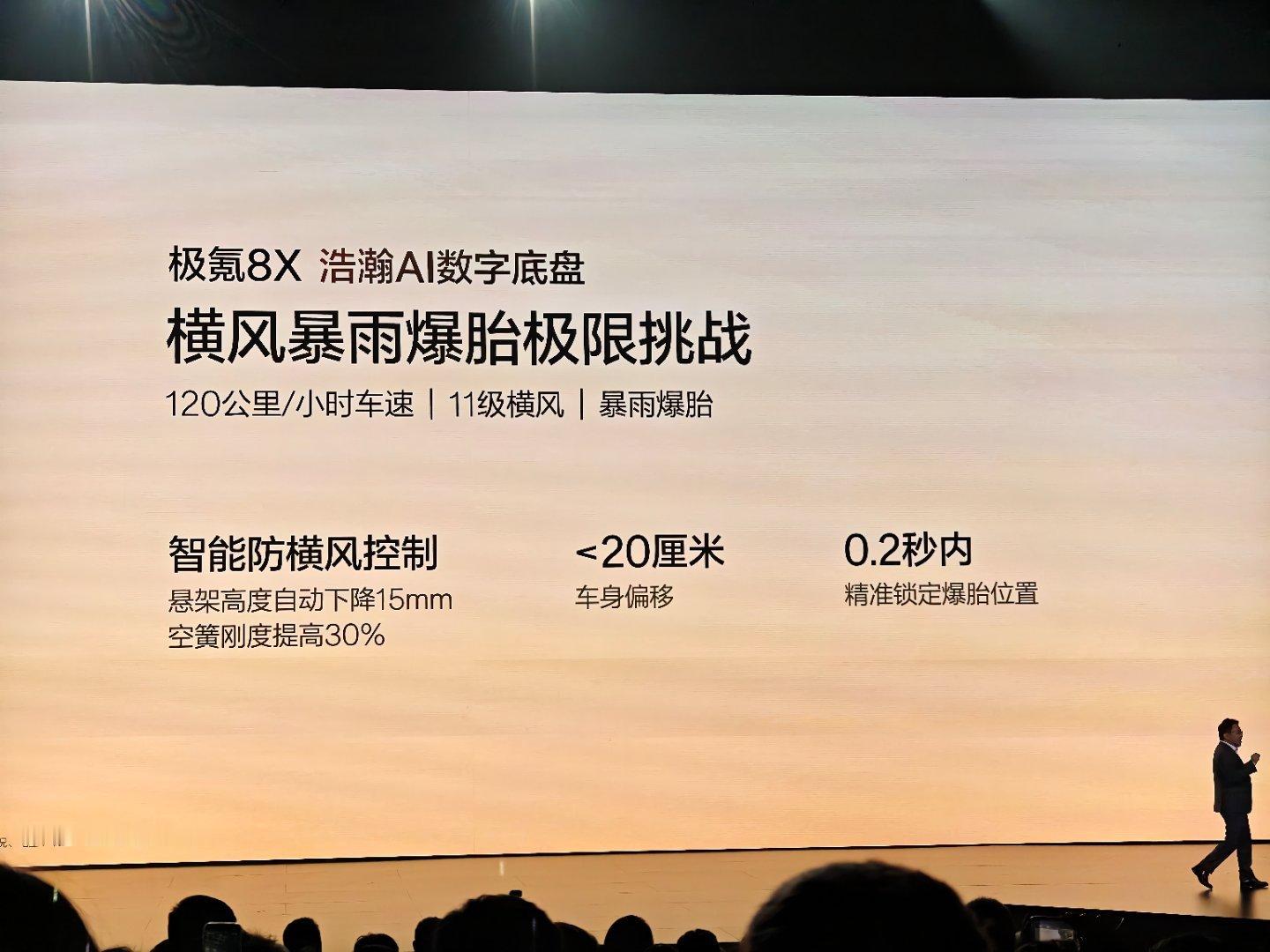 性能不仅要强,安全也要有保障,极氪8X 搭载的浩翰AI数字底盘,120公里/小时的时速下,能够应对11级的横风,和暴雨爆胎。安全,是检验豪华的第一标准。