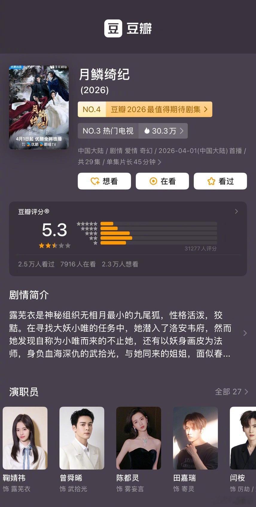 鞠婧祎、曾舜晞、陈都灵、田嘉瑞《月鳞绮纪》豆瓣开分5.3分