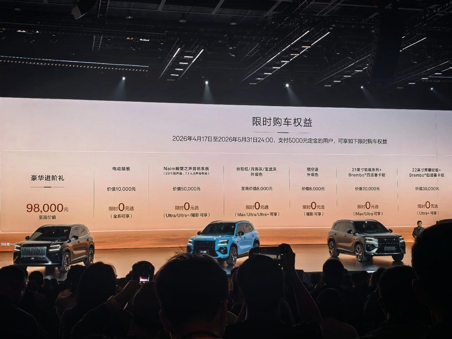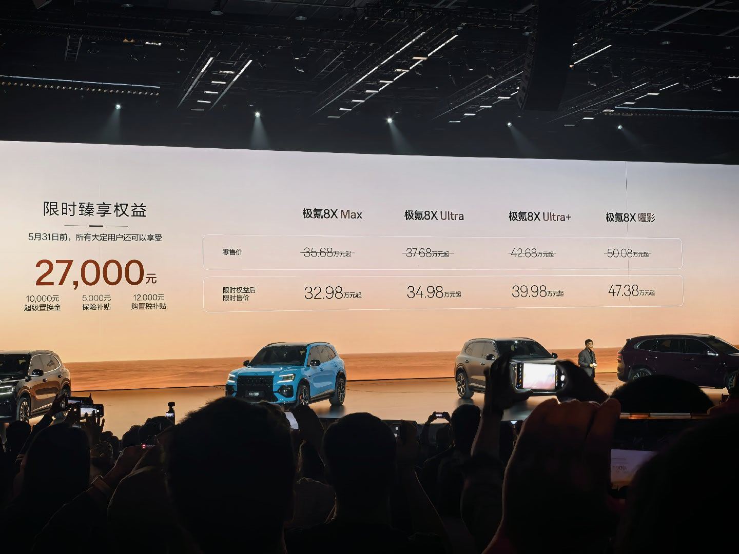 极氪8X 正式上市价格:曜影版:50.08万元Ultra+版:42.68万元Ultra版:37.68万元Max版:35.68万元权益见图最后还给出了2.7万元的限时权益减下来的价格:曜影版:47.38万元Ultra+版:39.98万元Ultra版:34.988万元Max版:32.98万元 极氪8X上市限时售价32.98万元起