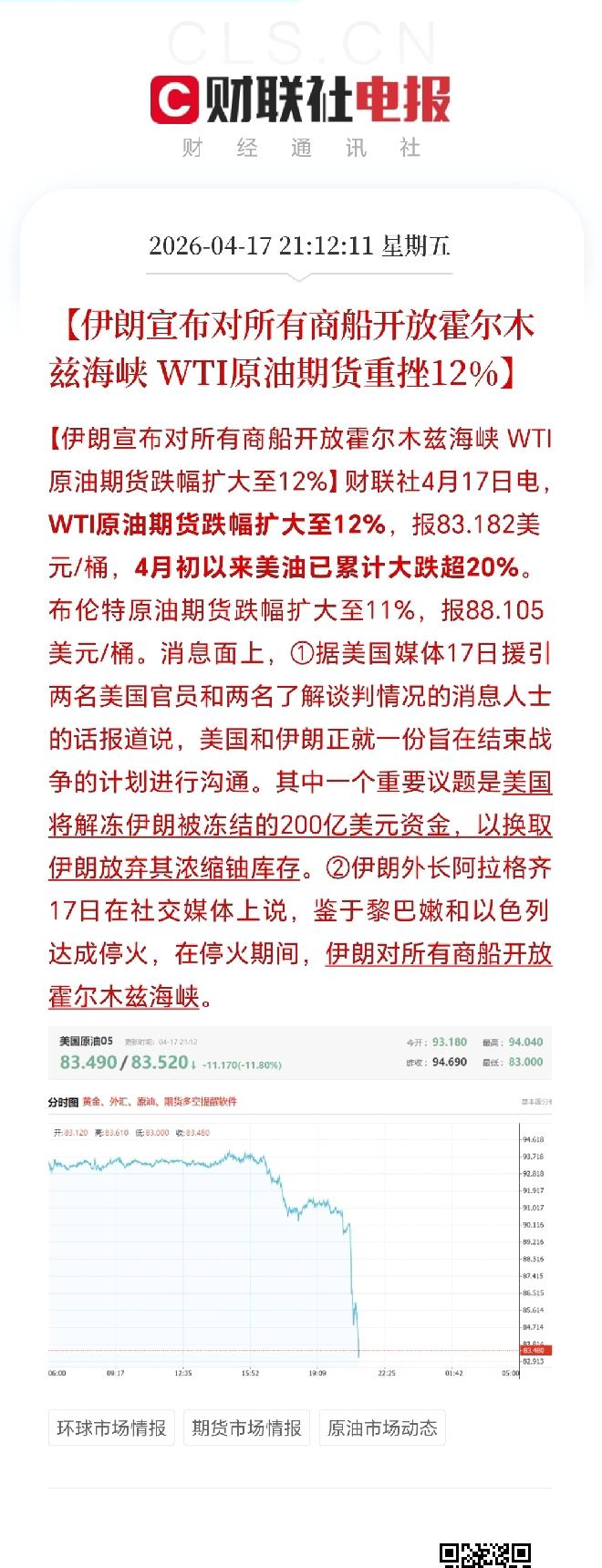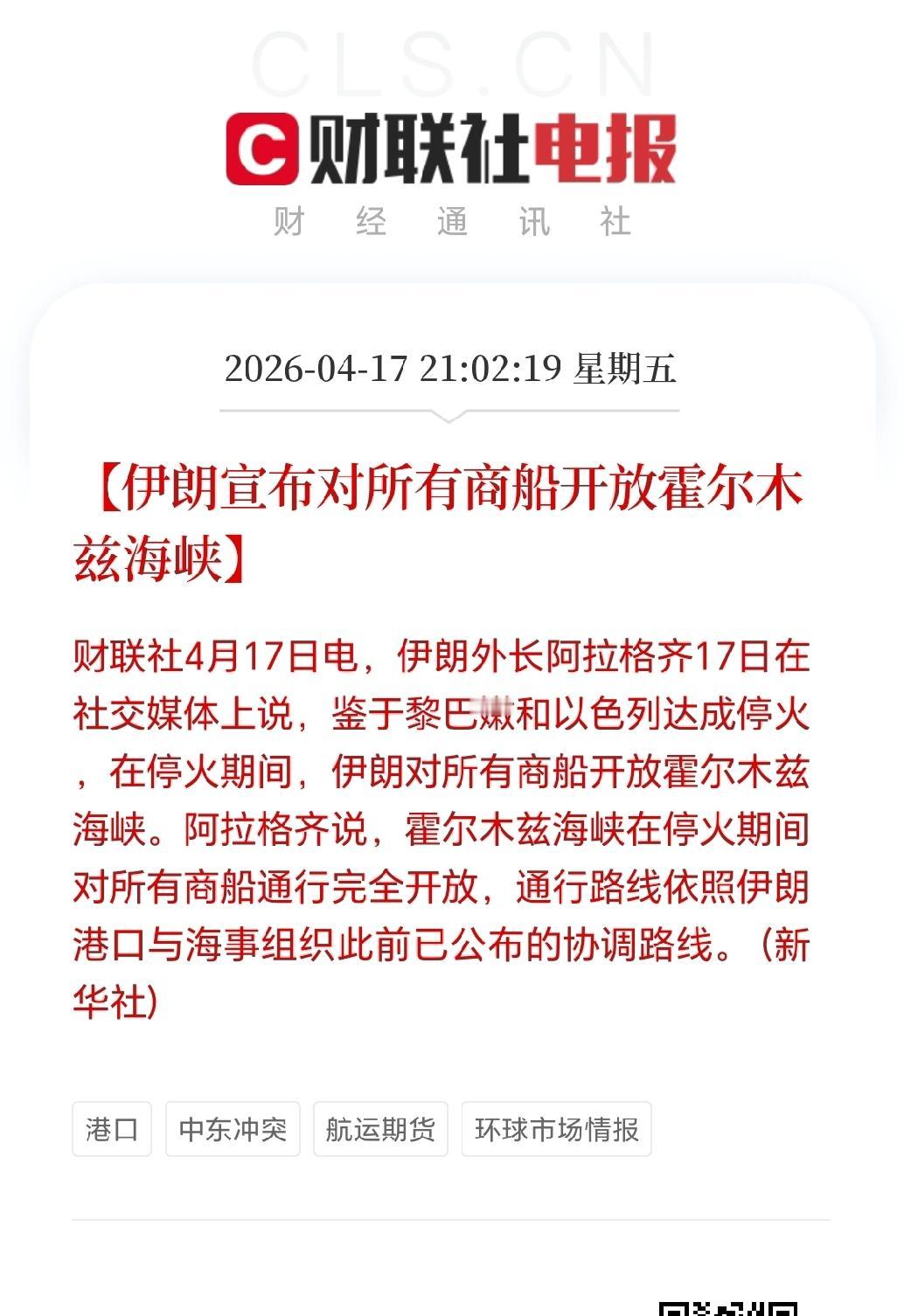 大消息啊! 伊朗宣布对所有船只放开霍尔木兹海峡,这消息一出来,原油价格立马暴跌。 霍尔木兹海峡可是全球石油运输的关键通道,大约三分之一的海运石油都得从这儿过。 当地时间17日,伊朗外长阿拉格齐在社交媒体发文,基于黎巴嫩停火协议,在停火剩余时间里,商船按已公布路线通行该海峡完全开放。 这一开放意味着石油运输更顺畅,市场上的原油供应可能会增加,油价自然就撑不住开始跌了。这不仅影响石油市场,对全球经济也会有连锁反应,后续值得持续关注。