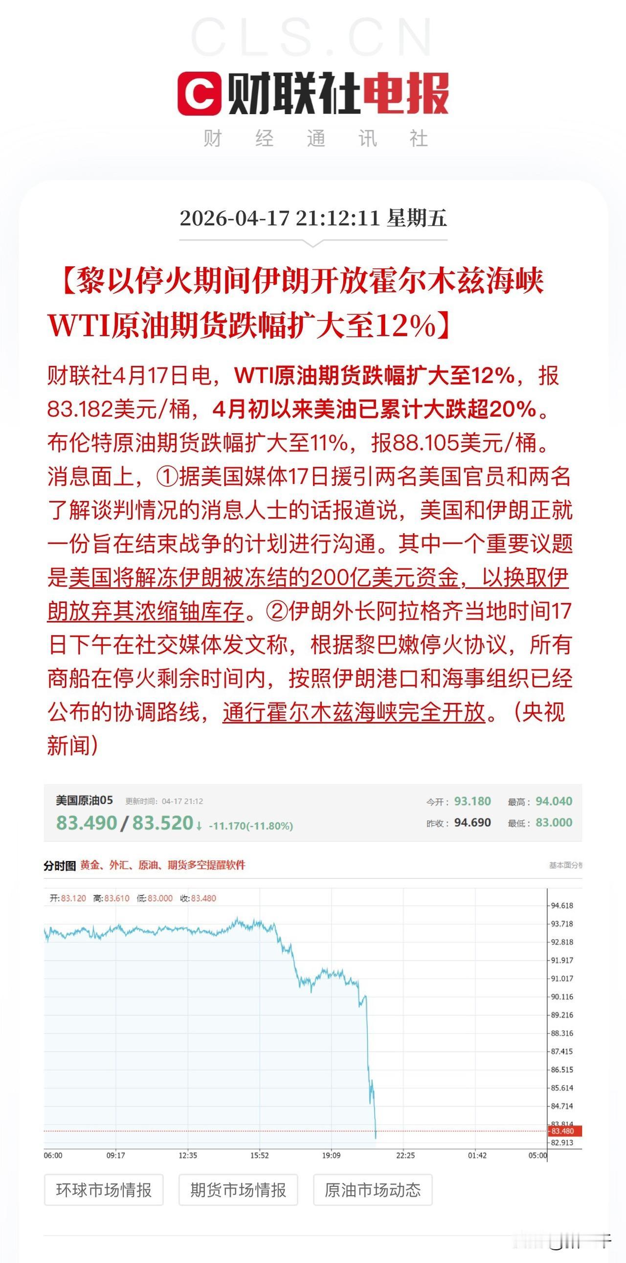 原油再次大跌! 美伊谈判触及实质性内容, 包括黎以停火; 黎以停火期间开放霍尔木兹海峡; 在浓缩铀有解决方案前提下, 解冻200亿美元伊朗资产; 美元指数也抹去了地缘风险以来所有涨幅! 华尔街机构开始吹风美元放水, 给的理由让白宫无法拒绝: 美元不放水不足以支撑当前美股继续前行! 这一波美A共振上涨的科技行情, 似乎也来到了尾声了… 10年一遇的科技行情真可谓波澜壮阔了, 10倍科技牛股装满一箩筐, 而过去4年陷在消费医药里面的, 是一直在遭受不断新低的折磨! 情势转变不远了, 也许就在二季度! …