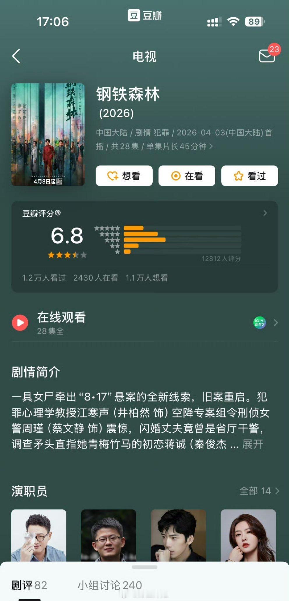 井柏然、蔡文静主演的《钢铁森林》db开分了,之前宣传好像还挺多的,但开分只有6.8分,你觉得客不客观呢?