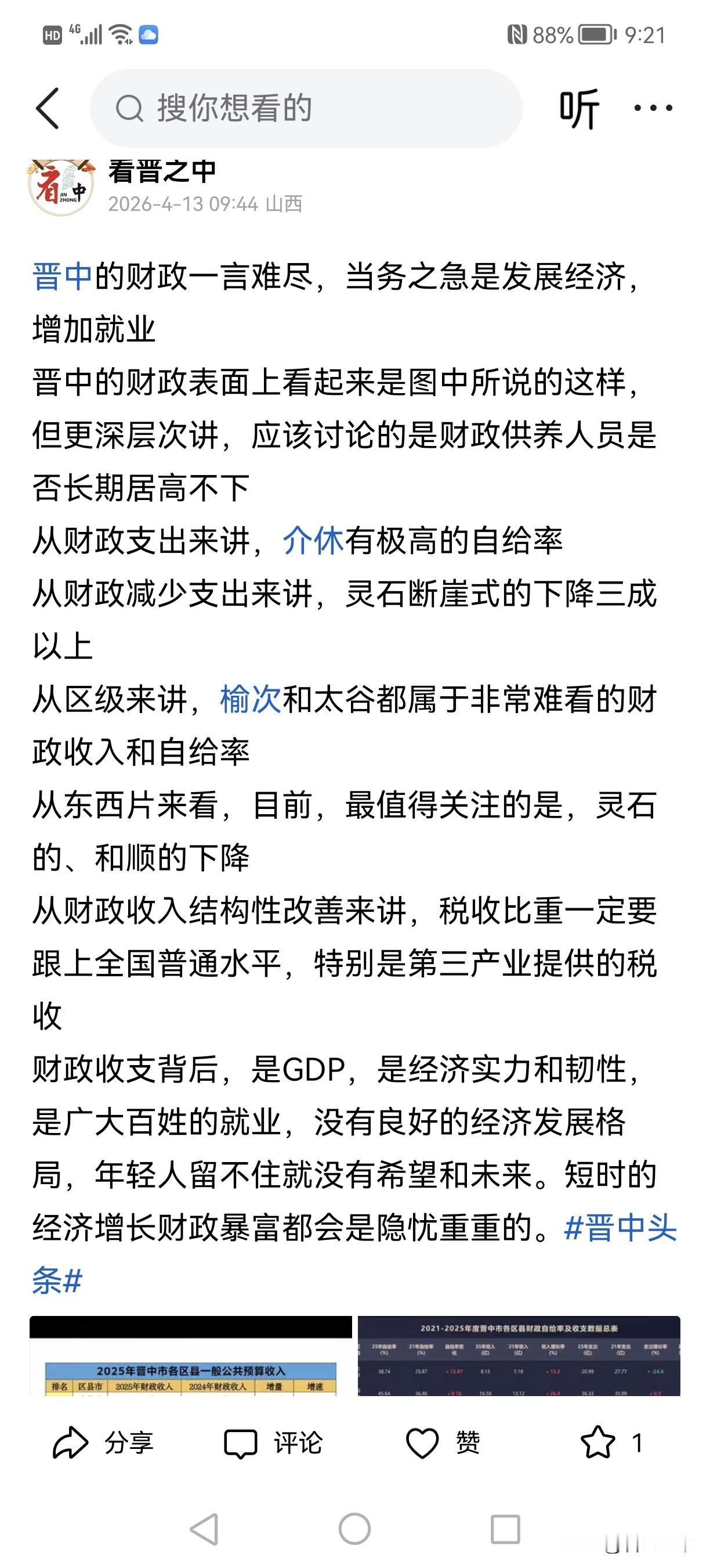 2026年一季度灵石的地方财政收入为3.88亿元。 这是晋中当下最让人揪心的消息。 我们常讲财政收入比GDP数据可靠多了,那得用票票来真切地堆。 灵石曾是全国县级财政标兵县,是晋中经济的顶梁柱,下滑不可小觑,麻雀需要解剖。 灵石的财政成色是总量小了非税更无。发展工业大县的繁荣度,才能保证财政富县的持续性。现在,暂遇困难千万别乱了阵脚。 一是要坚决增加投资,但杠杆要控制。 二是要大力发展三产,保持社会活力。 三是要克制征缴力度,不去竭泽而渔。