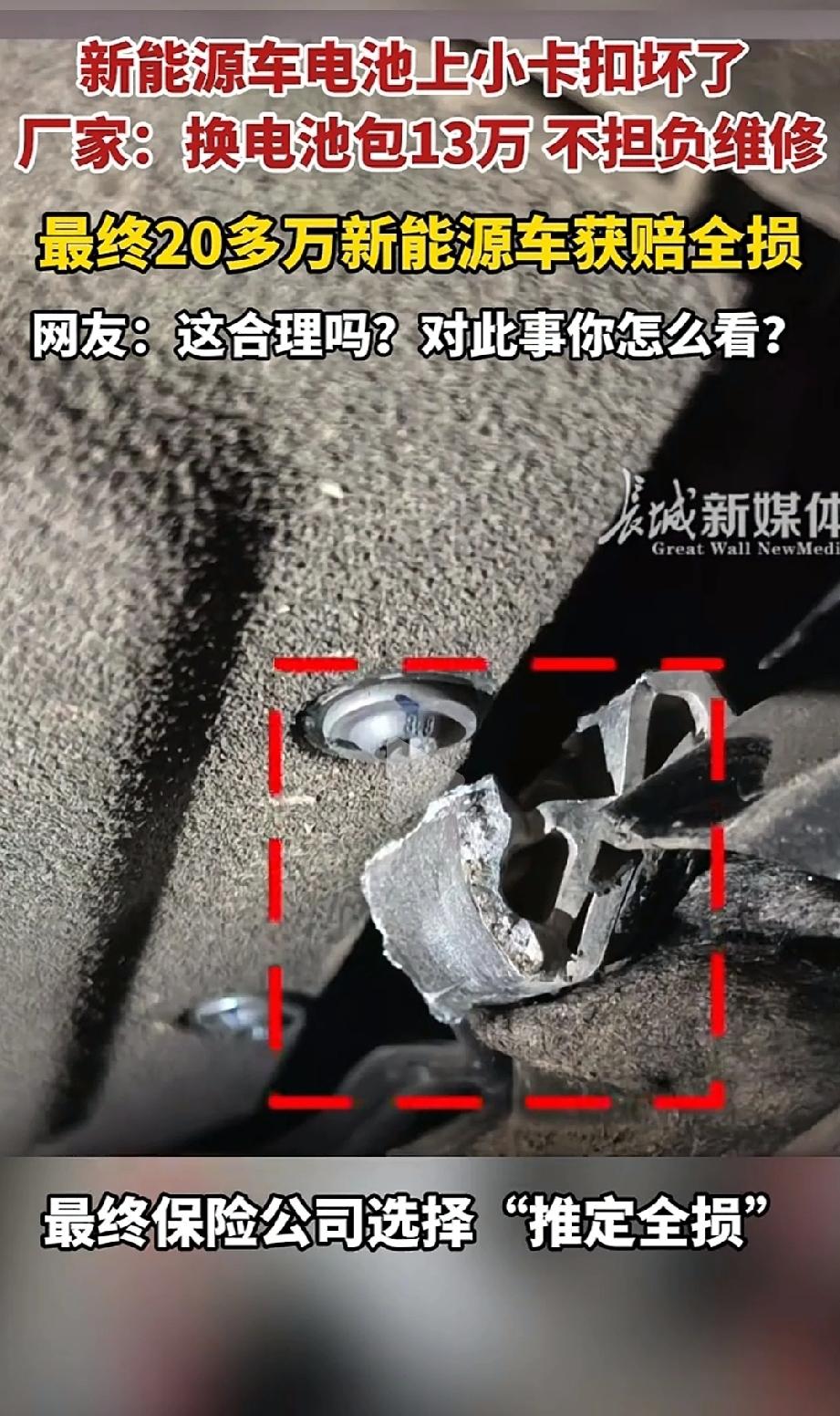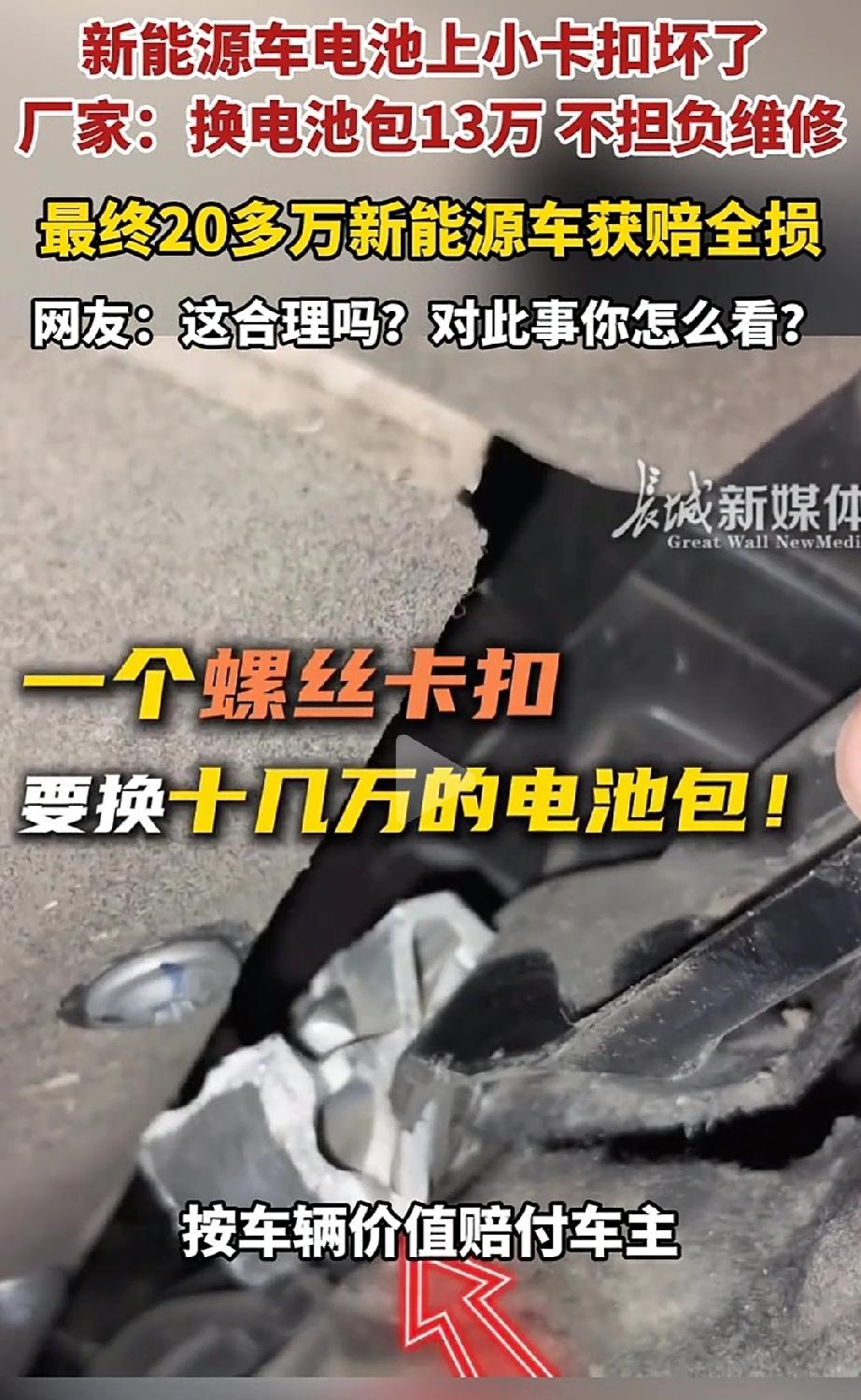 你敢信吗?一车主买了辆二十多万的新能源汽车,新车才开一个月,电池包外壳的小卡扣就断裂了。本以为只是很简单的破损,没成想,厂家表示不能单独修卡扣,必须花13万换整个电池包,快赶上车价的一半了,厂家不肯担责!网友:这合理吗?对此事你怎么看? 事情是这样的:这位车主开着自己二十多万的新能源车,才爽了一个月,电池包外壳上的一个卡扣就断了。 说实话,卡扣嘛,听着就是个不起眼的小零件。但问题是,这个卡扣跟电池盒是一体成型的,厂家说了——不能单独修,要修就得换整个电池包,报价13万! 车主当时就懵了:我就坏了一个卡扣,你让我花13万? 更惨的是,保险公司也不愿意单独赔这个电池,最后直接按全损处理。什么叫全损?就是车不修了,保险公司按整车价值赔给你,但车就报废了。 车主最后不仅车没了,自己花近一万块贴的膜也打了水漂,一分钱都拿不回来。 凭啥一个卡扣坏了要换整个电池包? 很多网友可能跟我一样,第一反应就是:这不扯呢吗? 但仔细一了解,还真不是这一家厂家黑心,背后有几个现实原因: 第一,新能源车的电池成本能占到整车价格的50%以上,有些车型甚至更高。这么贵的东西,厂家当然不愿意给你拆开来修,一换就是一整个总成,省事还赚钱。 第二,电池包、外壳、卡扣这些东西都做成了一体的,好处是结构更紧凑、空间利用率更高,但坏处就是——坏了哪都得换全套。说白了,这不就跟现在手机不能换电池一个道理吗? 第三,三电系统(电池、电机、电控)的维修技术,外面修理厂根本搞不了,你想找便宜的地方修都没门路,只能乖乖回4S店挨宰。 有网友说:“以前买车是买车,现在买车是请了个祖宗回来供着。” 更网友直接喊话厂家:“你们造车的时候能不能动动脑子?卡扣这种易损件,你做成一体成型的,这不是故意给车主挖坑吗?” 买新能源车的时候,商家都说用车便宜、养车划算,可真到坏了要修的时候,就露出了真面目。 你想想,卡扣是什么?就是个连接件、固定件,天天震动、受力,它本身就是最容易坏的东西之一。 你把这种易损件跟价值十几万的电池包做成一体,坏了就只能换总成,这设计合理吗? 这到底是技术上的不得已,还是故意制造维修壁垒,逼着车主回店挨宰? 我不是说厂家一定坏,但至少,这种设计对消费者来说,太不友好了。 专家的建议,“车电分离”——把车和电池分开买、分开投保,电池坏了只赔电池,不用连累整车。 或者干脆直接买能换电的车型、选择租电池的模式。 但说句实在话,这些办法都是治标不治本。 真正的问题在于:厂家在设计车的时候,有没有把“后续好不好修”这件事放在心上? 一辆车不是一次性筷子,开个三五年很正常,中间难免磕磕碰碰、零件老化。你今天为了省事做成一体化,明天车主修车就要多花几万甚至十几万。这笔账,最终还不是消费者来扛? 我们支持新能源,支持技术创新,但前提是,你得让老百姓开得起、也修得起。如果换个卡扣都要花半辆车的钱,那这车谁还敢买? 换电池小卡扣要13万 新能源车主崩溃