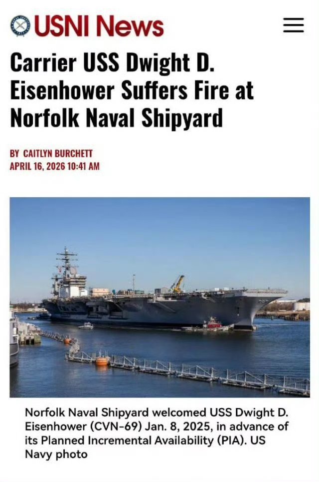 美国航母又“着火”了美国航母“艾森豪威尔”号在维修期间发生了一起小火灾,三名水