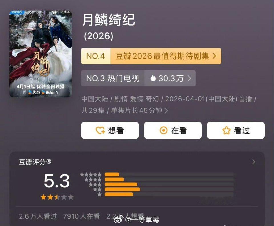 们古偶的评分《白日提灯》评分6.7,8.1万人评分《月鳞绮纪》评分5.3,3.1万人评分《冰湖重生》评分3.2,0.8万人评分