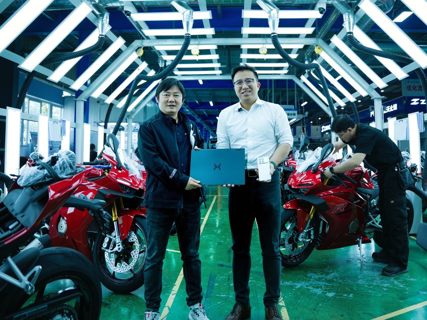 虽说“荣耀”和“张雪机车”一直都没公布双方具体会有哪些合作细节,但两者的联动明显越加频繁。这不!荣耀家高管又去张雪机车参观了,而且还带去了一大堆荣耀产品。不难发现,荣耀今年貌似很是重视WIN系列,这次去参观直把WIN系列手机和刚刚公布的荣耀WIN游戏本都带去了。还别说,这游戏本造型和张雪机车工厂的机械氛围还挺搭。建议给张雪机车工程师都配一台,前提是不能工作时划水打游戏。荣耀高管称张雪是年轻版的李书福