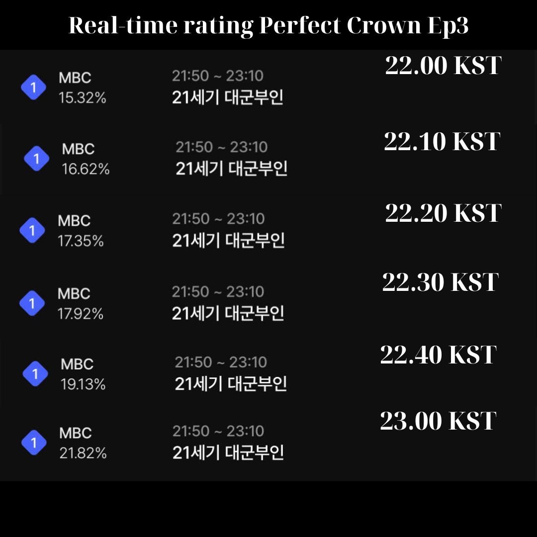21世纪大君夫人 IU x 边佑锡 『21世纪大君夫人』第三集实时收视率👑22.00 KST: 15.32%22.10 KST: 16.62%22.20 KST: 17.35%22.30 KST: 17.92%22.40 KST: 19.13%23.00 KST: 21.82%Rating Nationwide by Nielsen Korea maybe get 8-12% 21世纪大君夫人