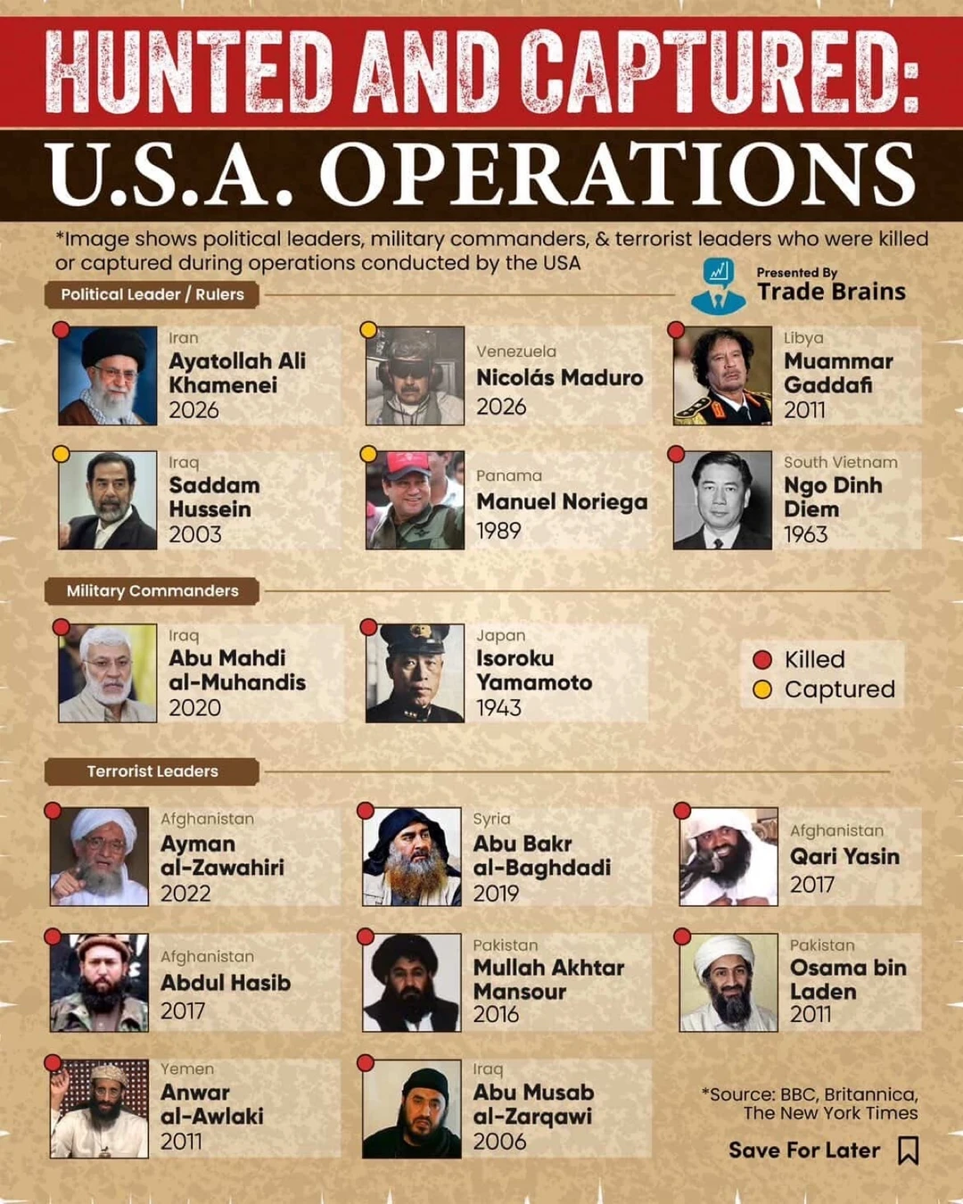 这张图汇总了在美国主导的军事行动中,被击毙或被捕的重要人物,包括政治领导人、军事指挥官以及恐怖组织头目。图中用红点表示被击毙,黄点表示被捕。
