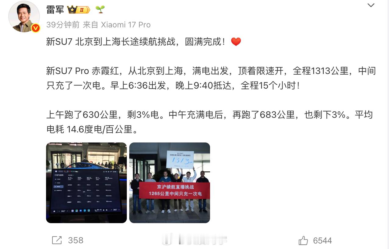 新SU7 北京到上海长途续航挑战完成了,顶着限速开,全程1313公里,中间只充了一次电,雷总团队全程干了15小时,也是够努力的,哈哈。