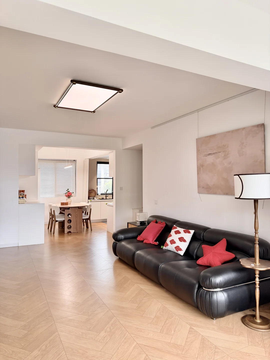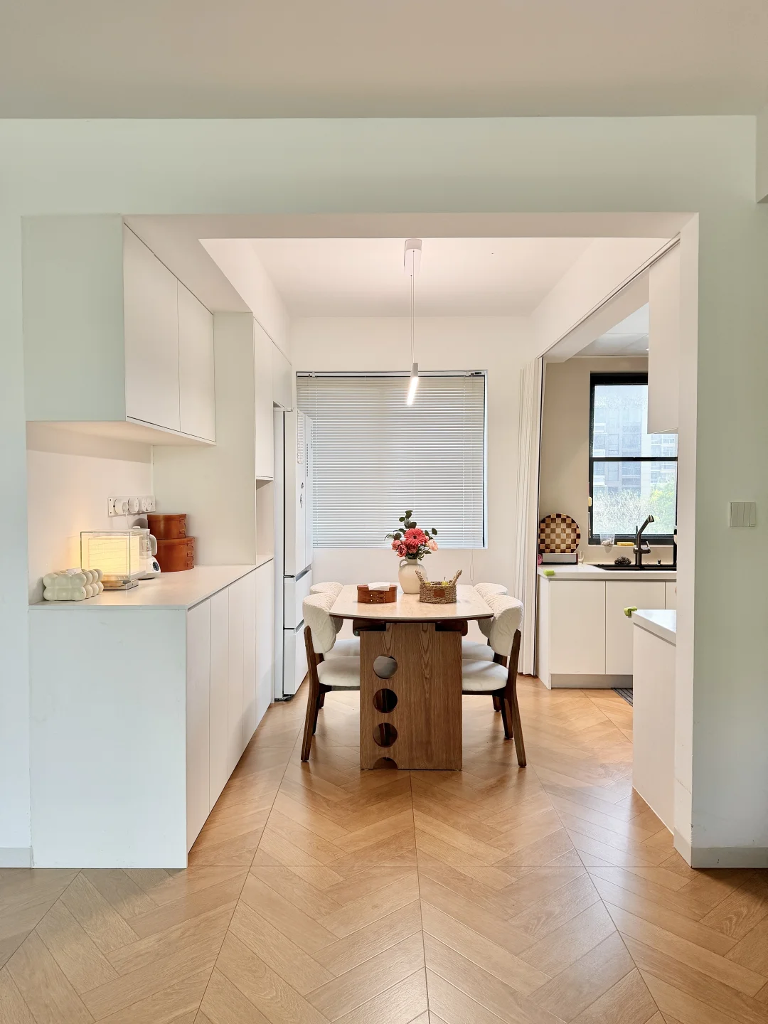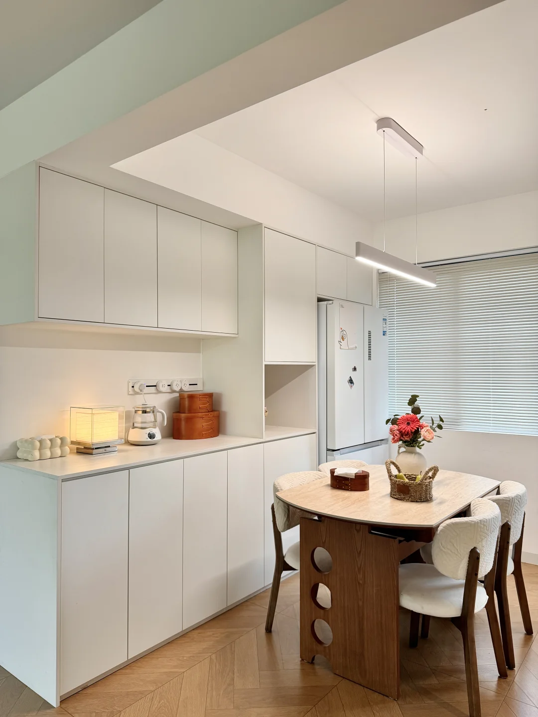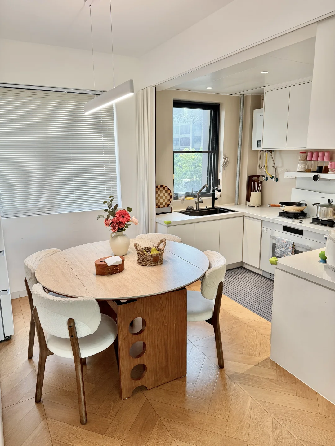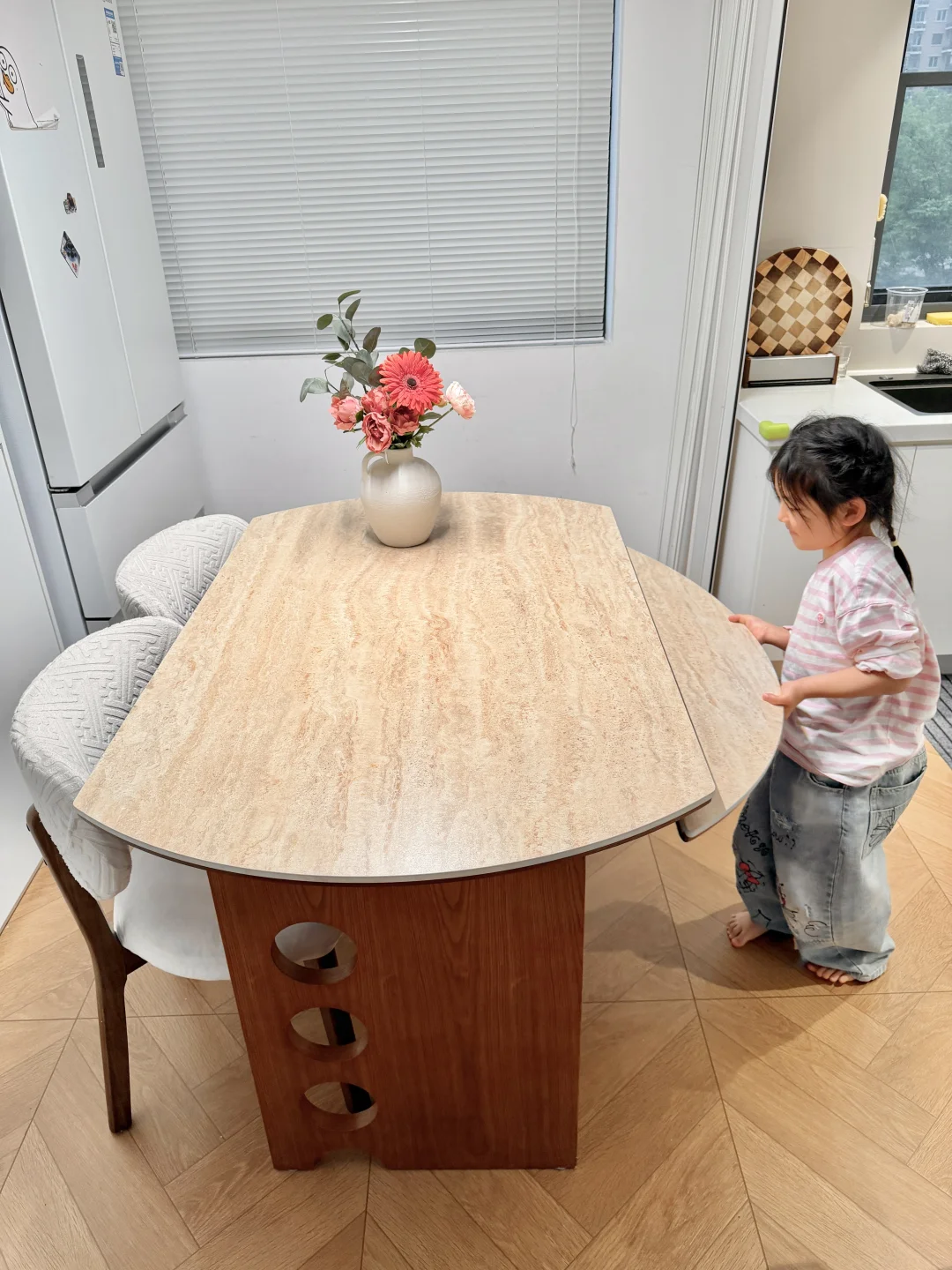 放了可以方圆桌任意切换的岩板餐桌,平时家里人多聚餐就打开用圆桌,一家四口的时候用方桌,不占地方