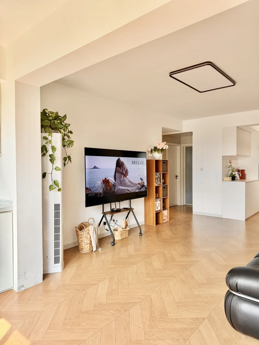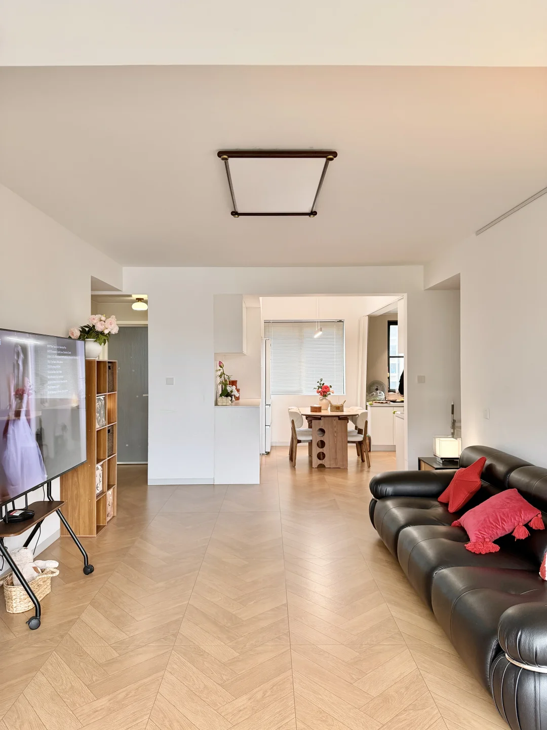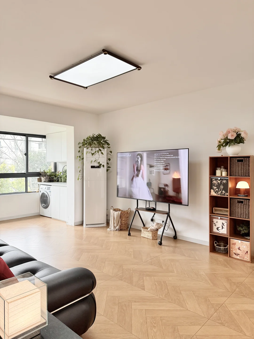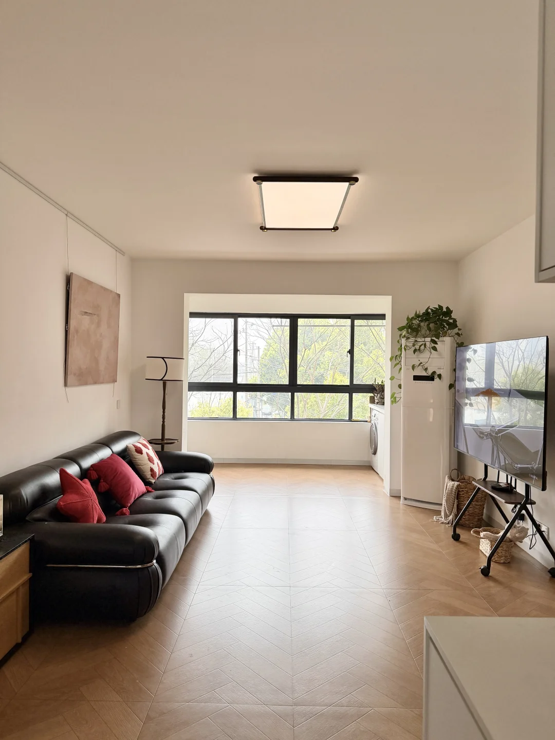 客厅开间3.2米,没有打电视柜,放了落地电视加一张沙发,空间显得更大