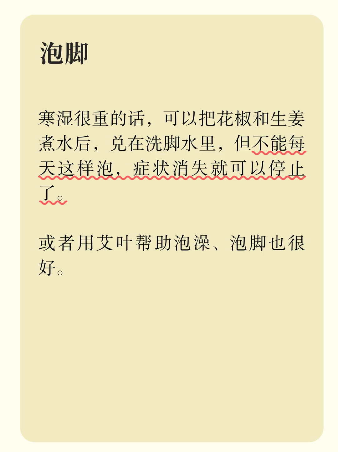 第[四R],泡脚。寒湿很重的话,还可以把花椒和生姜煮水后,兑在洗脚水里,但不能每天这样泡,症状消失就可以停止了。或者用艾叶帮助泡澡、泡脚也很好。