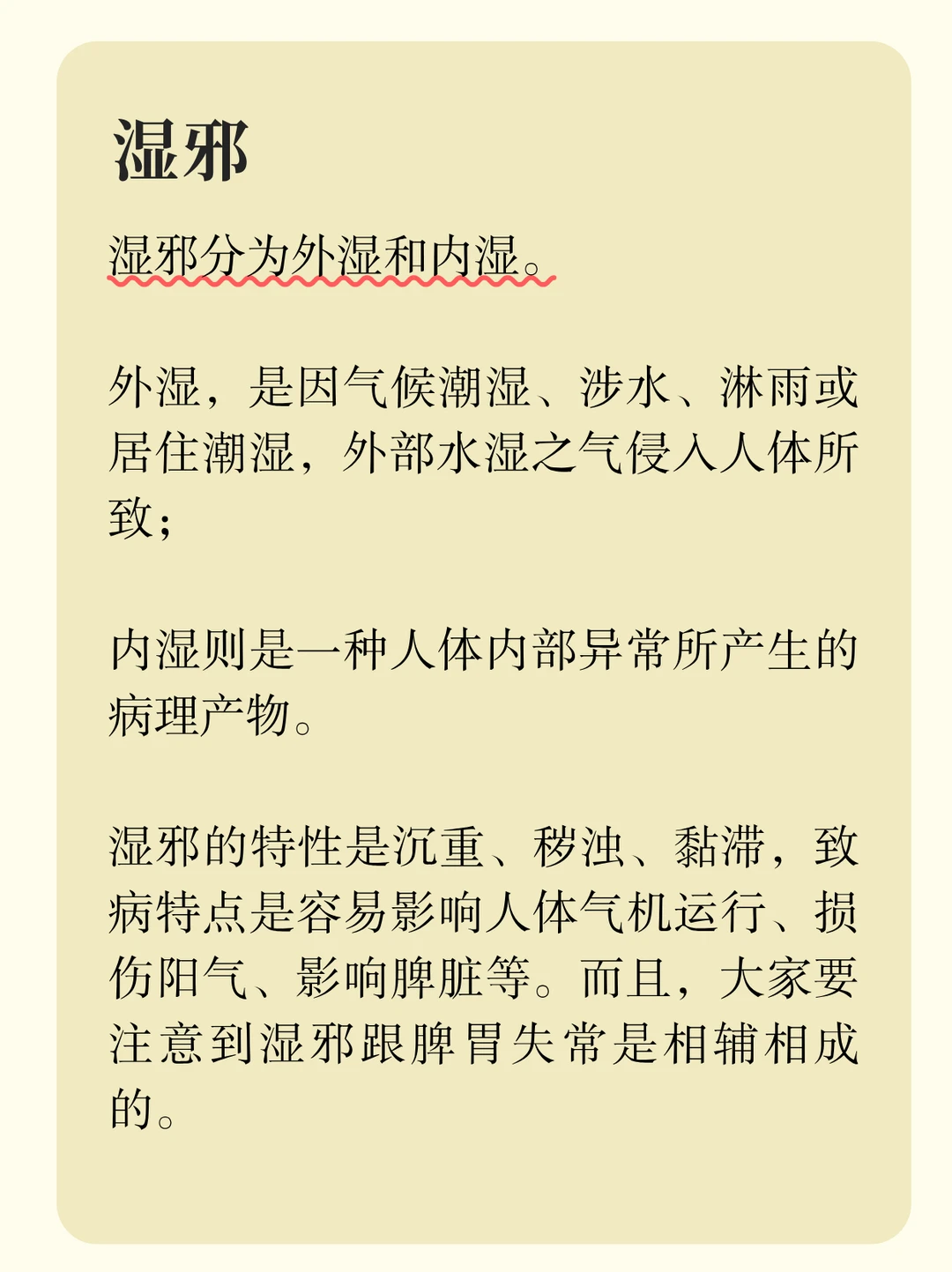 外湿,是因气候潮湿、涉水、淋雨或居住潮湿,外部水湿之气侵入人体所致;内湿则是一种人体内部异常所产生的病理产物。湿邪的特性是沉重、秽浊、黏滞,致病特点是容易影响人体气机运行、损伤阳气、影响脾脏等。而且,大家要注意到湿邪跟脾胃失常是相辅相成的。
