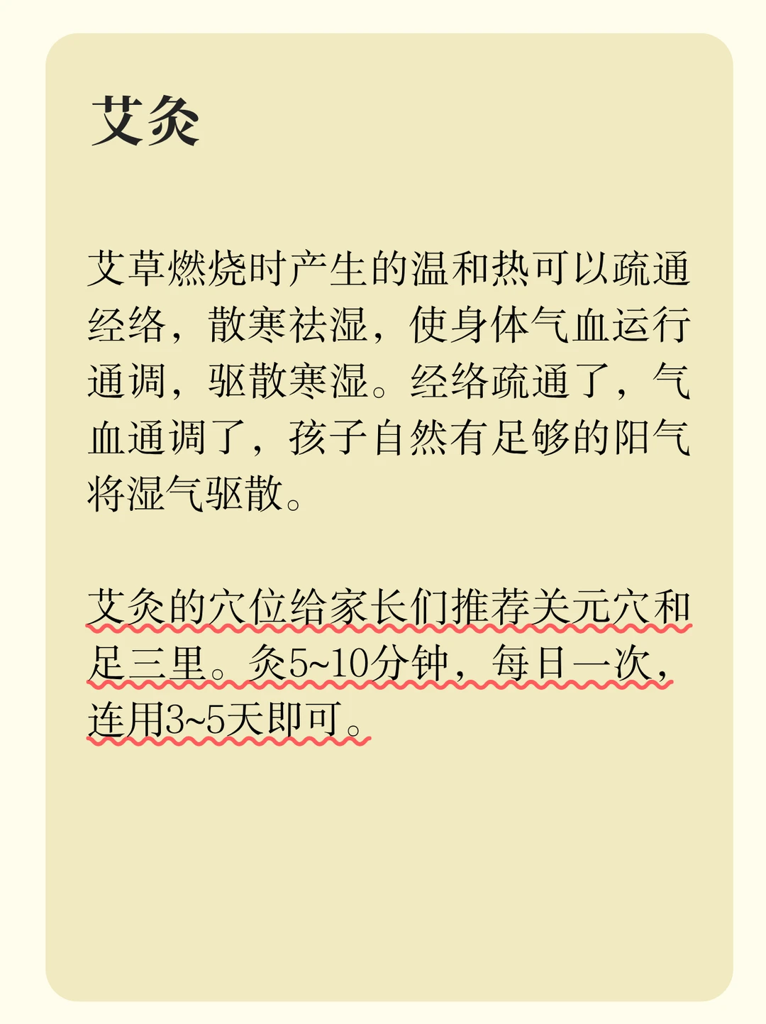 第[二R],艾灸。艾草燃烧时产生的温和热可以疏通经络,散寒祛湿,使身体气血运行通调,驱散寒湿。经络疏通了,气血通调了,孩子自然有足够的阳气将湿气驱散。艾灸的穴位给家长们推荐关元穴和足三里。灸5~10分钟,每日一次,连用3~5天即可。