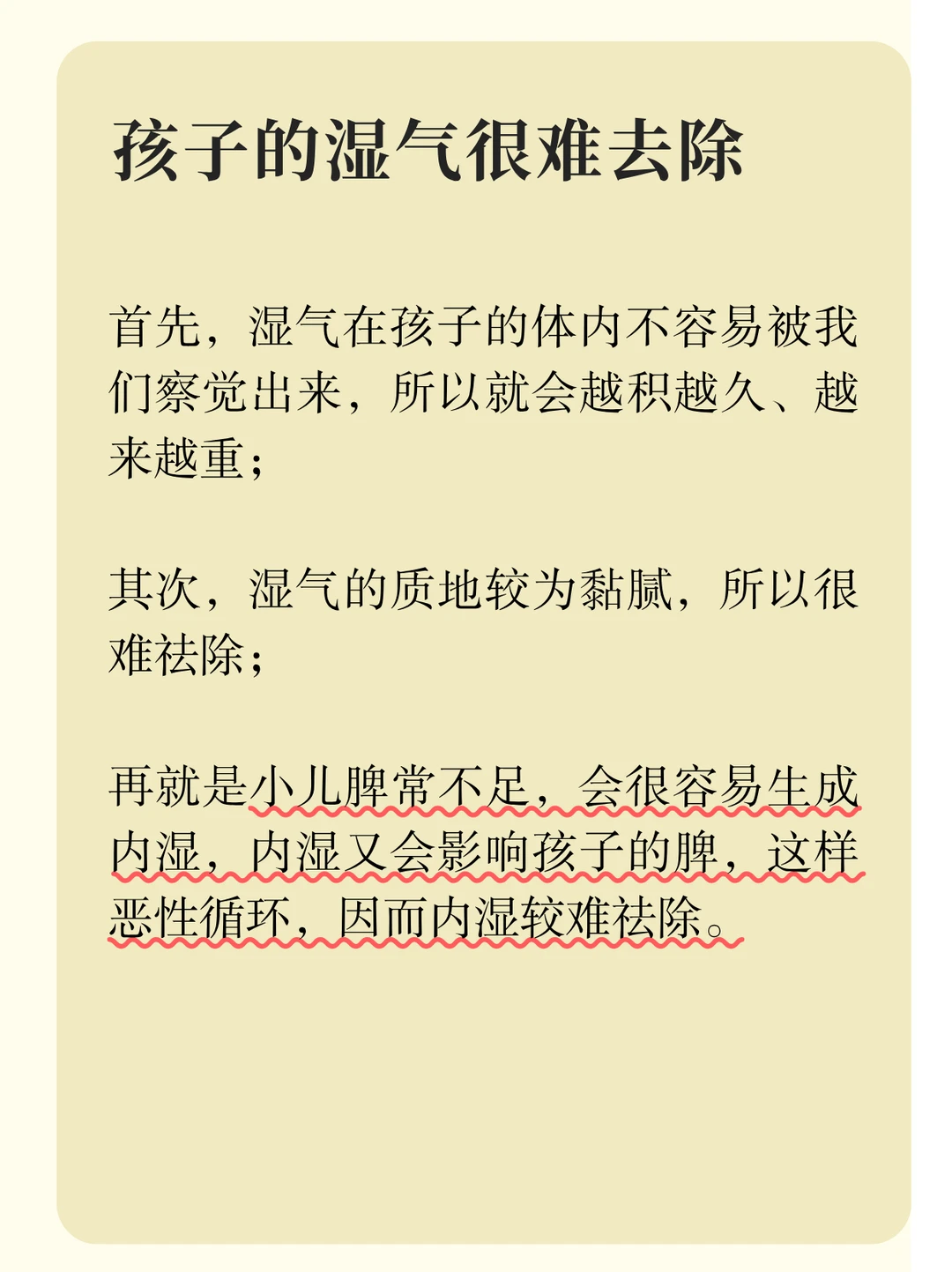 首先,湿气在孩子的体内不容易被我们察觉出来,所以就会越积越久、越来越重;其次,湿气的质地较为黏腻,所以很难祛除;再就是小儿脾常不足,会很容易生成内湿,内湿又会影响孩子的脾,这样恶性循环,因而内湿较难祛除。[石化R]