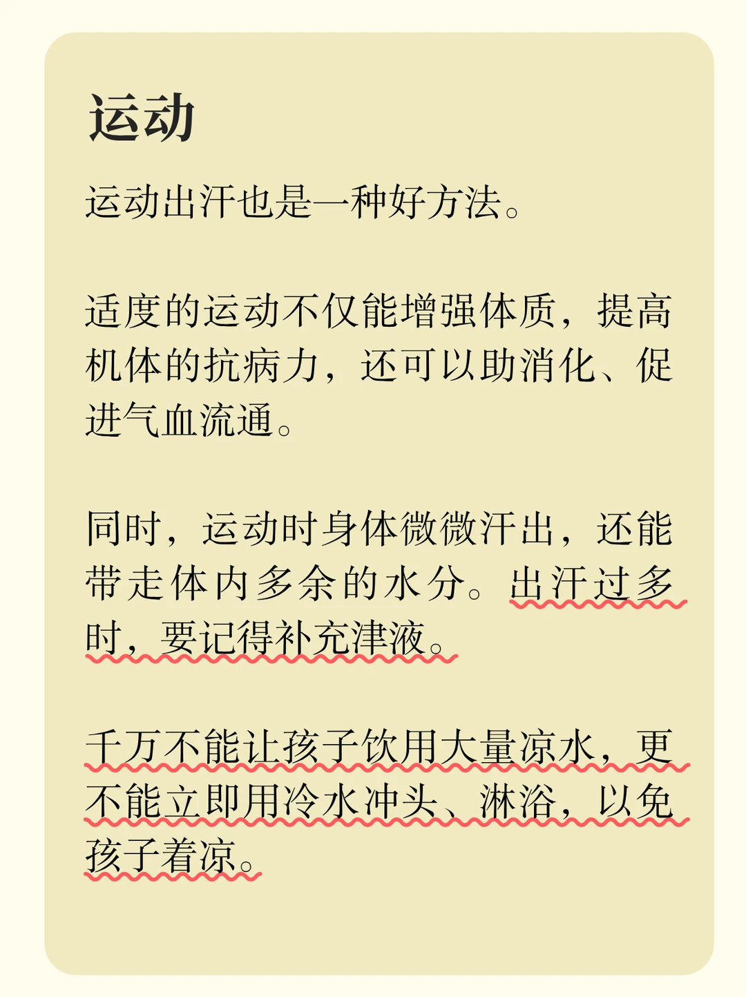 第[三R],多运动。运动出汗也是一种好方法。适度的运动不仅能增强体质,提高机体的抗病力,还可以助消化、促进气血流通。同时,运动时身体微微汗出,还能带走体内多余的水分。出汗过多时,要记得补充津液。千万不能让孩子饮用大量凉水,更不能立即用冷水冲头、淋浴,以免孩子着凉。